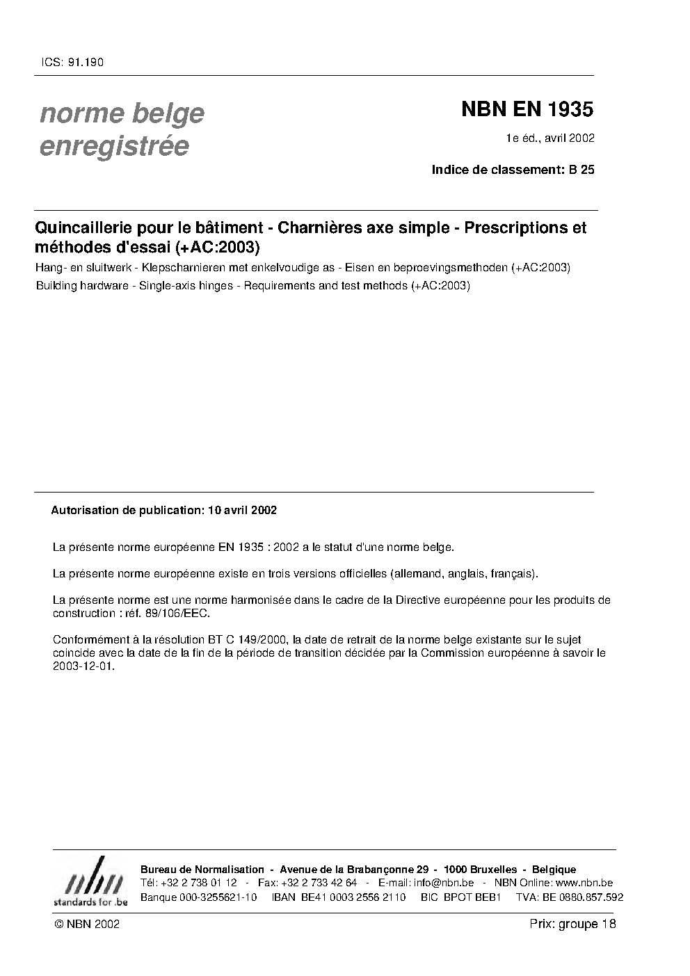 | Publisher | Bureau de Normalisation Belge (NBN) |