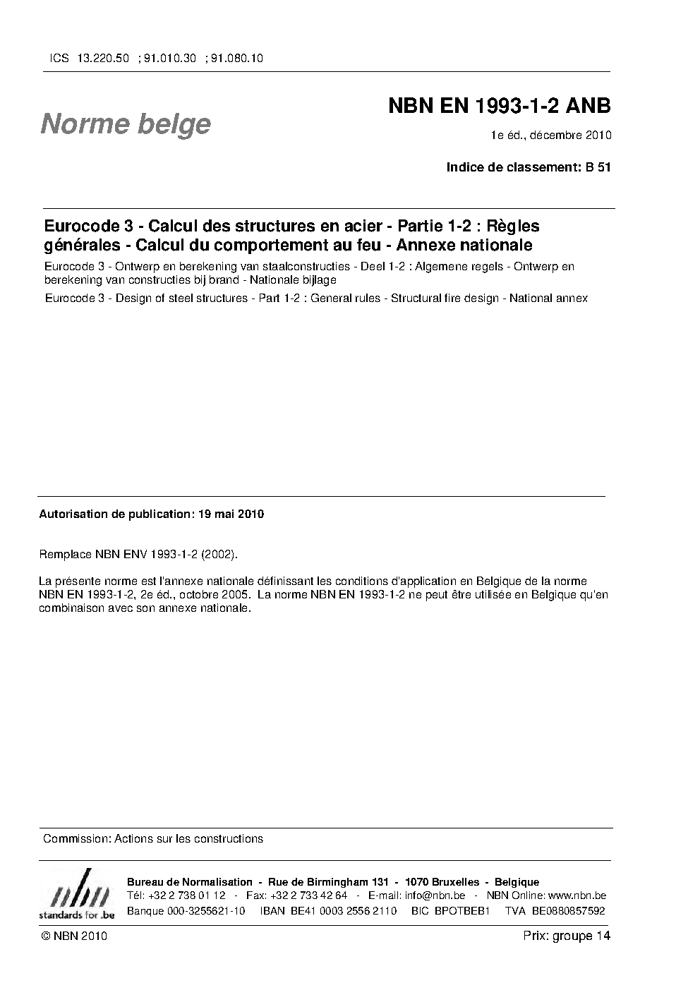 La présente norme NBN EN 1993-1-2 ANB:2010 est "l'Annexe nationale - nationale bijlage" (ANB) définissant les conditions d'applications en Belgique de la norme NBN EN 1993-1-2:2005. La norme NBN EN 1993-1-2:2005 comprend cette annexe nationale NBN EN 1993-1-2 ANB:2010 qui a un caractère normatif en Belgique.