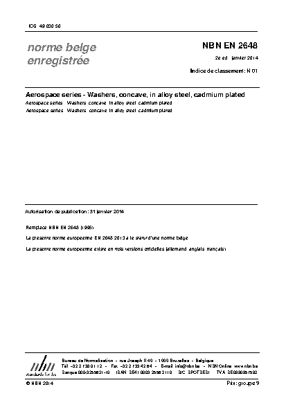 This standard specifies the characteristics of concave washers, in alloy steel, cadmium plated, maximum operating temperature 235 °C. They are intended to be used with nuts to EN 2647.