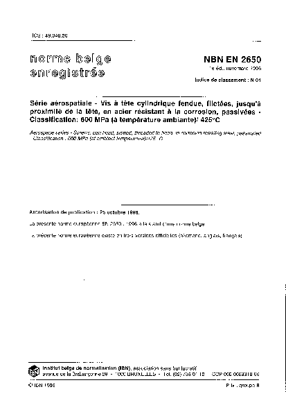 This standard specifies the characteristics of screws, pan head, slotted, threaded to head, in corrosion resisting steel, passivated. Classification: 600 MPa / 425°C.