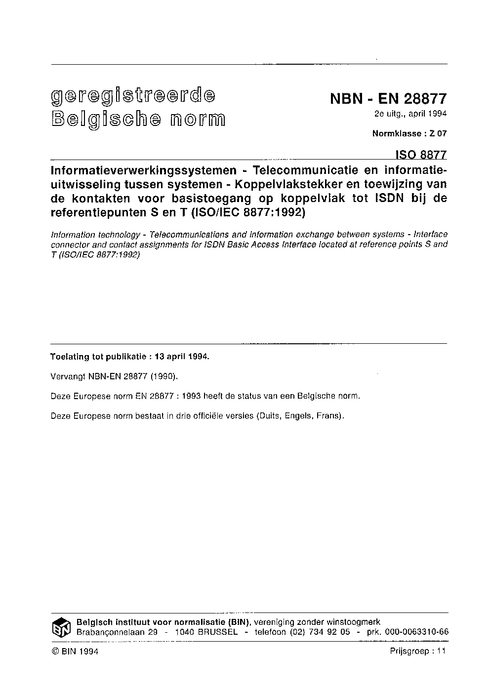 | Publisher | Bureau de Normalisation Belge (NBN) |
