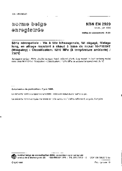 This standard specifies the characteristics of double hexagon headed bolts with relieved shank and long thread, in NI-P101HT, for aerospace applications. Classification: 1 210 MPa / 730 °C