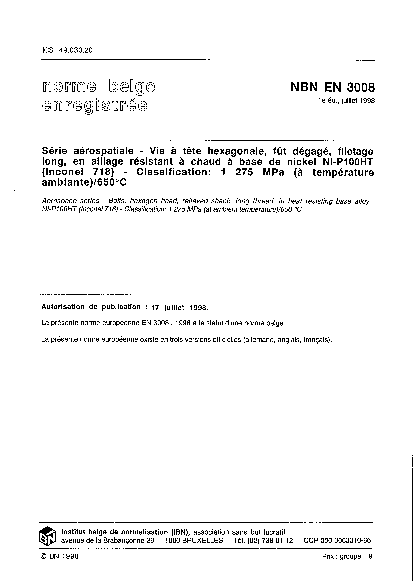 This standard specifies the characteristics of hexagon headed bolts with relieved shank and long thread, in NI-P100HT, for aerospace applications. Classification: 1275 MPa/650°C.