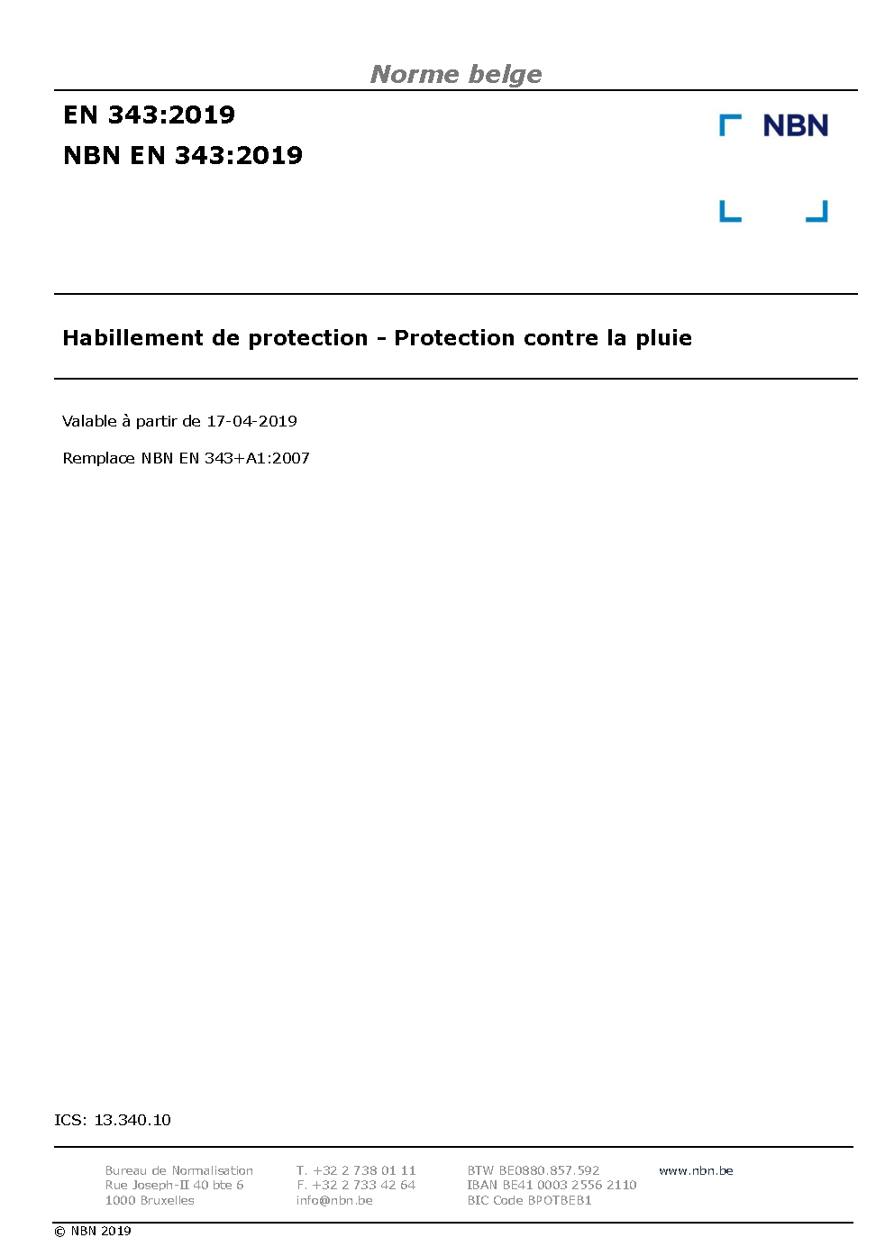 This European Standard specifies requirements and test methods applicable to materials and seams of protective clothing against the influence of precipitation (e. g. rain, snowflakes), fog and ground humidity.