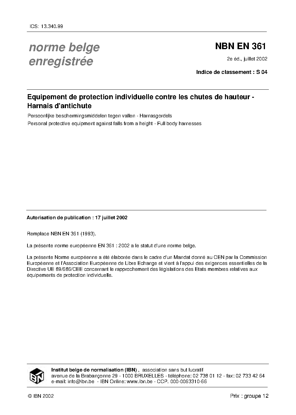 This European Standard specifies the requirements, test methods, marking, information supplied by the manufacturer and packaging for full body harnesses. Other types of body support, specified in other European Standards, e. g. EN 358, EN 813 or EN 1497, may be incorporated into the full body harness. Fall arrest systems are specified in prEN 363.
