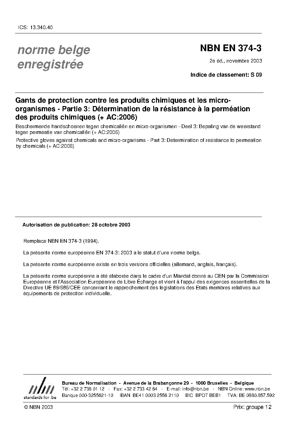 This European Standard specifies the determination of the resistance of protective glove materials to permeation by potentially hazardous non-gaseous chemicals under the condition of continuous contact.