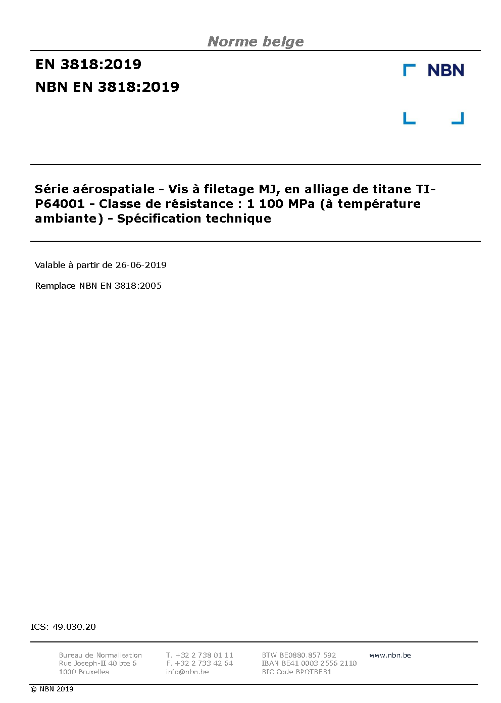 La présente norme européenne spécifie les caractéristiques, les exigences de qualification et de réception des vis à filetage MJ en TI-P64001, pour applications aérospatiales.