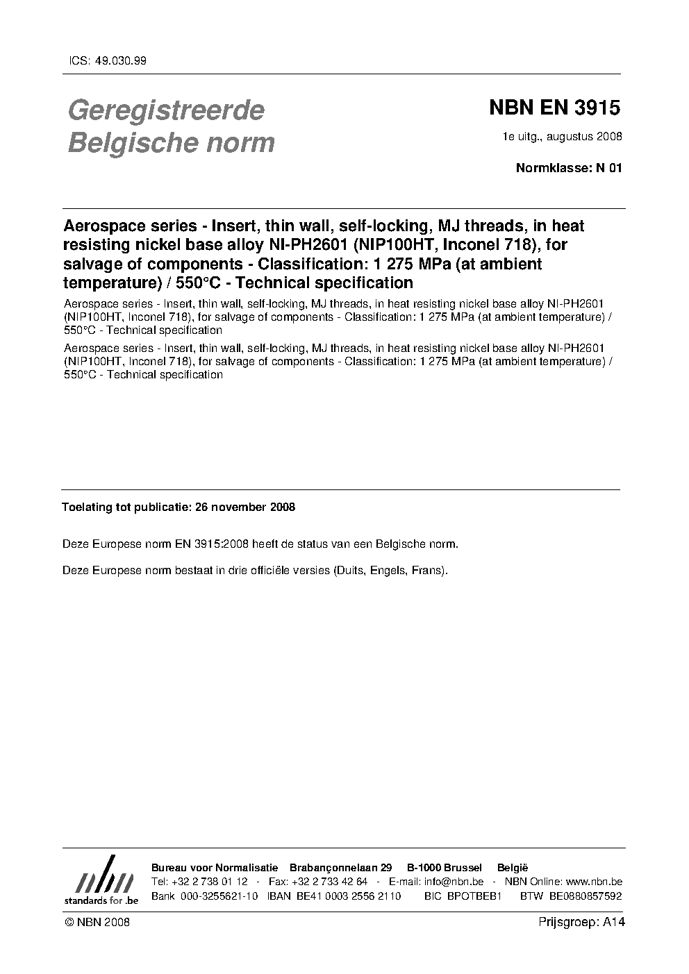 | Publisher | Bureau de Normalisation Belge (NBN) |