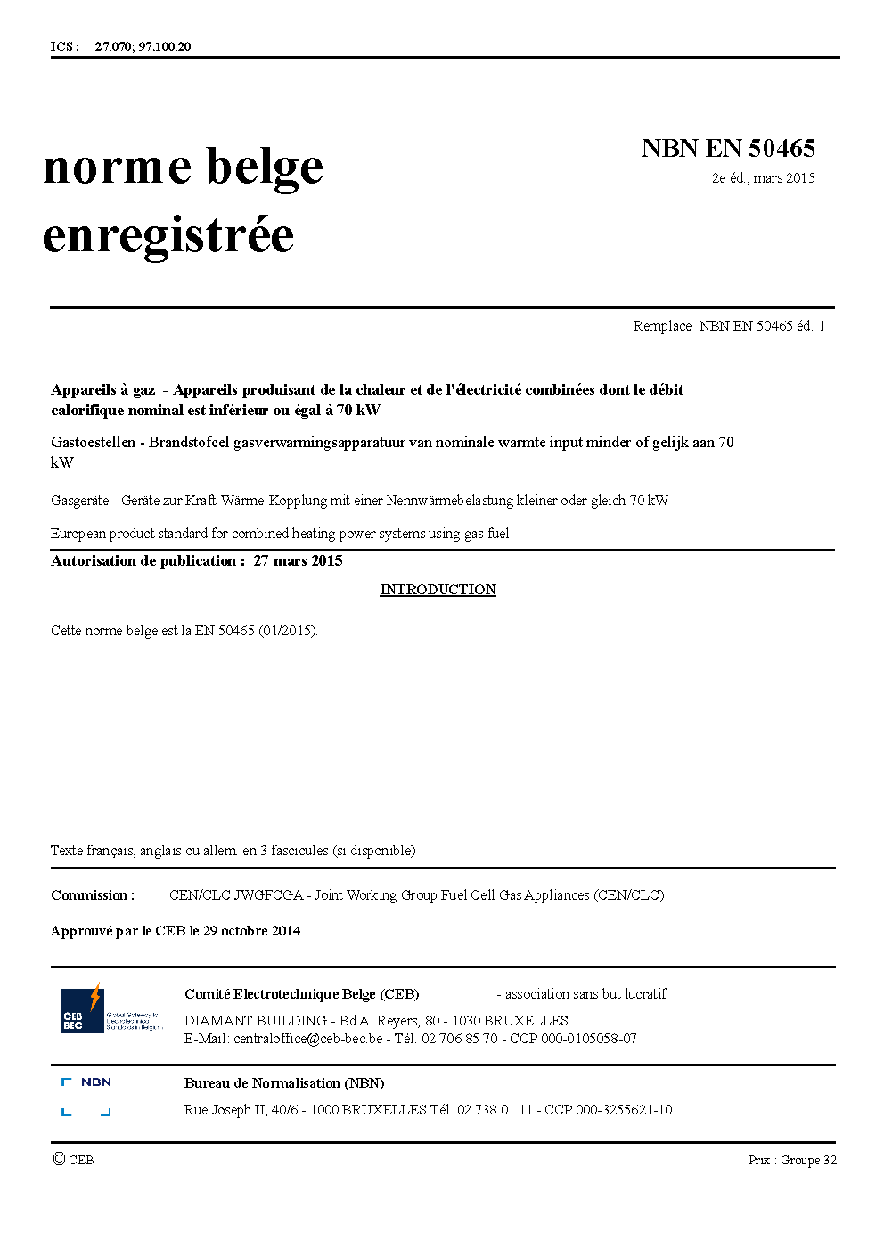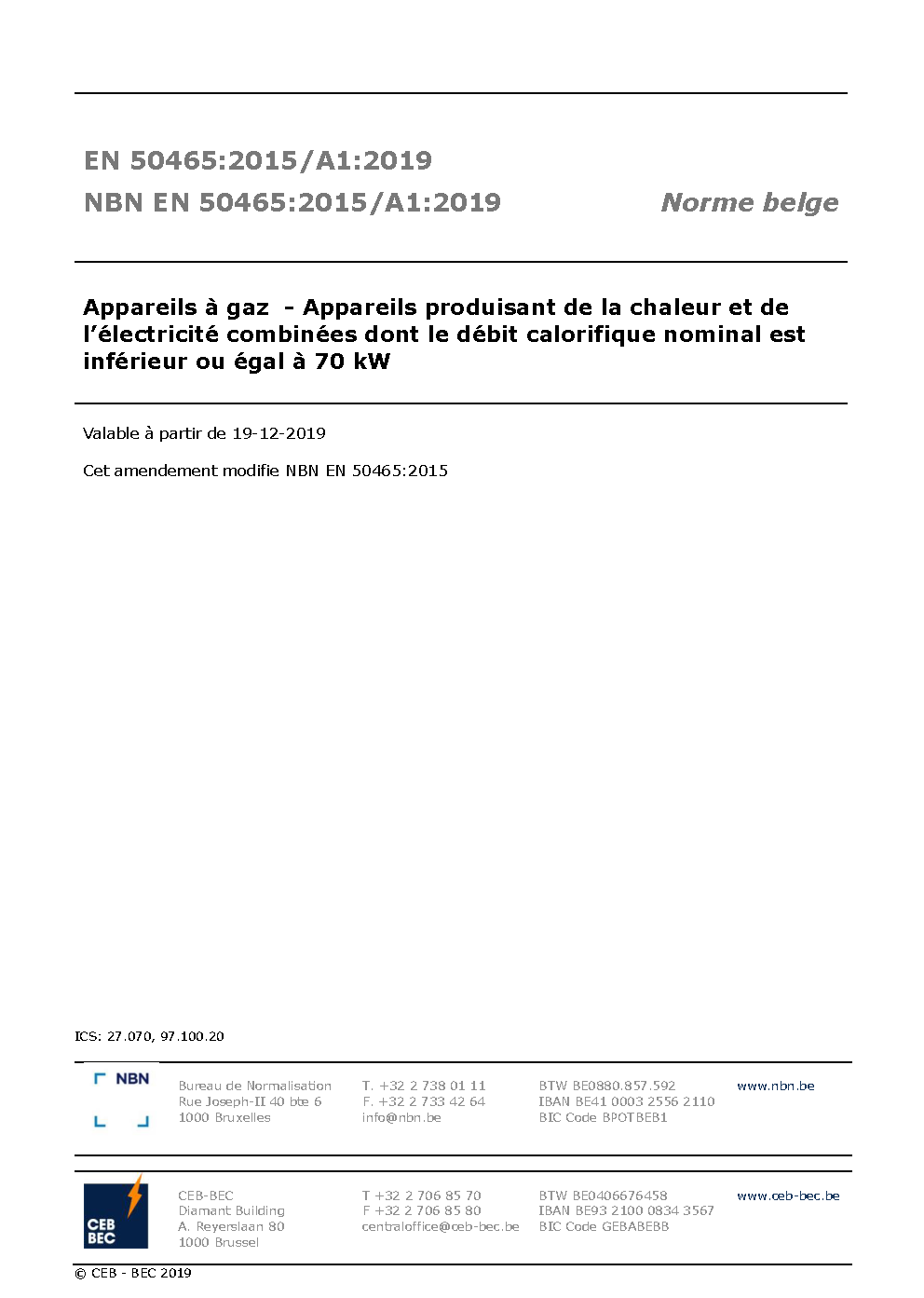 Gas appliances - Combined heat and power appliance of nominal heat input inferior or equal to 70 kW