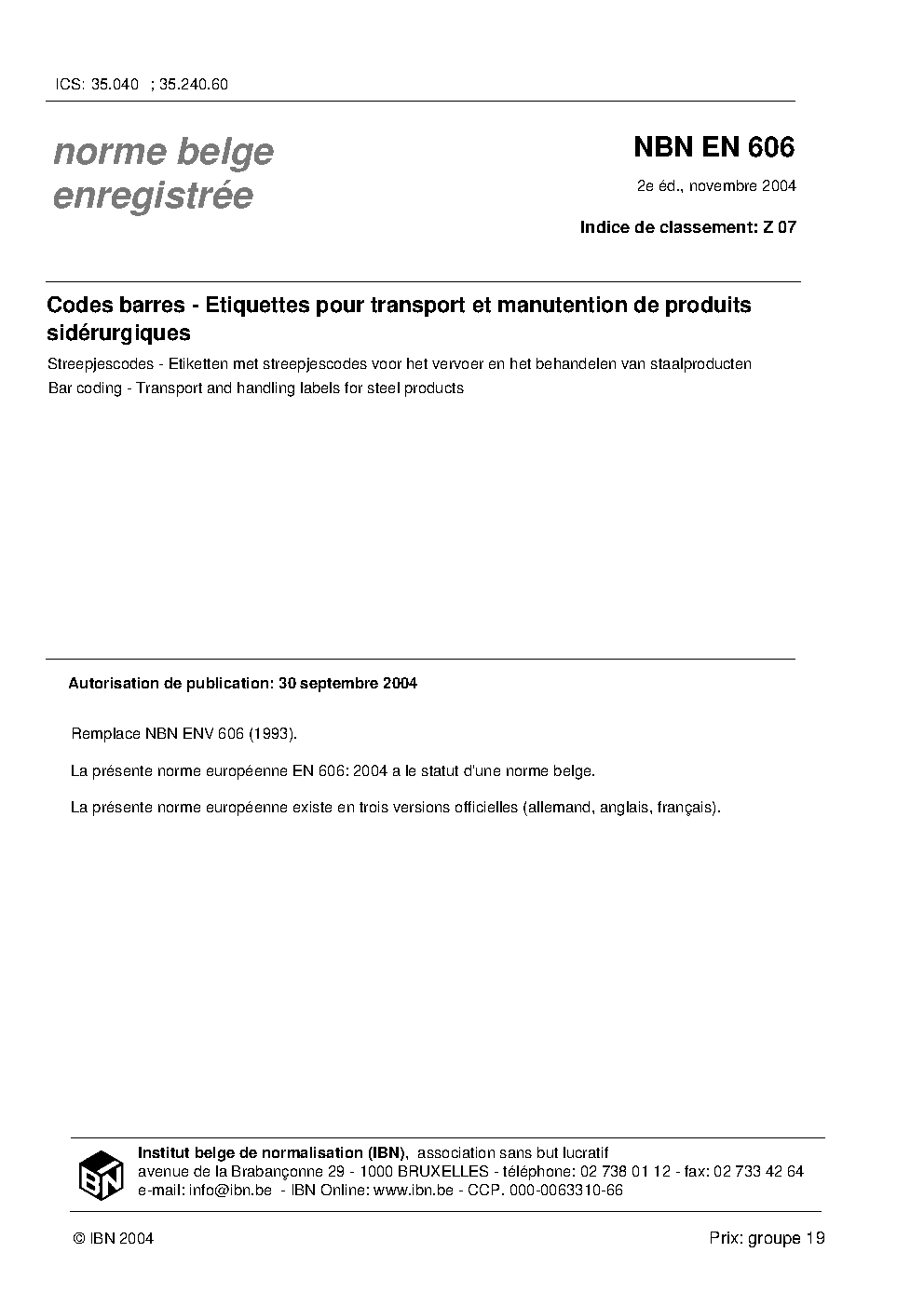| Publisher | Bureau de Normalisation Belge (NBN) |