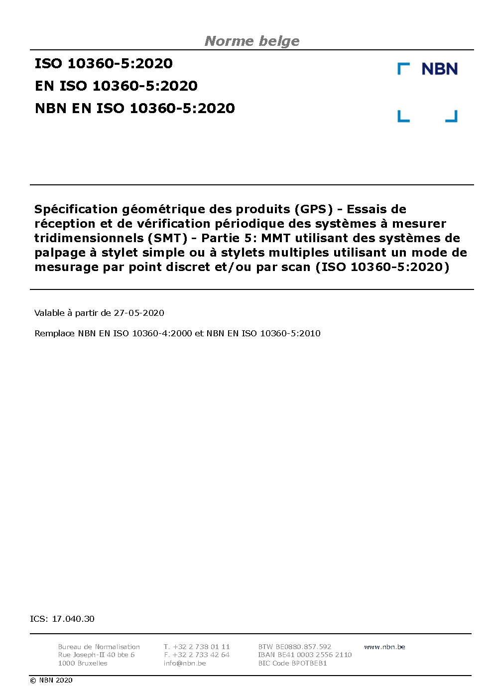 Geometrical product specifications (GPS) - Acceptance and reverification tests for coordinate measuring systems (CMS) - Part 5: Coordinate measuring machines (CMMs) using single and multiple stylus contacting probing systems using discrete point and/or scanning measuring mode (ISO 10360-5:2020)