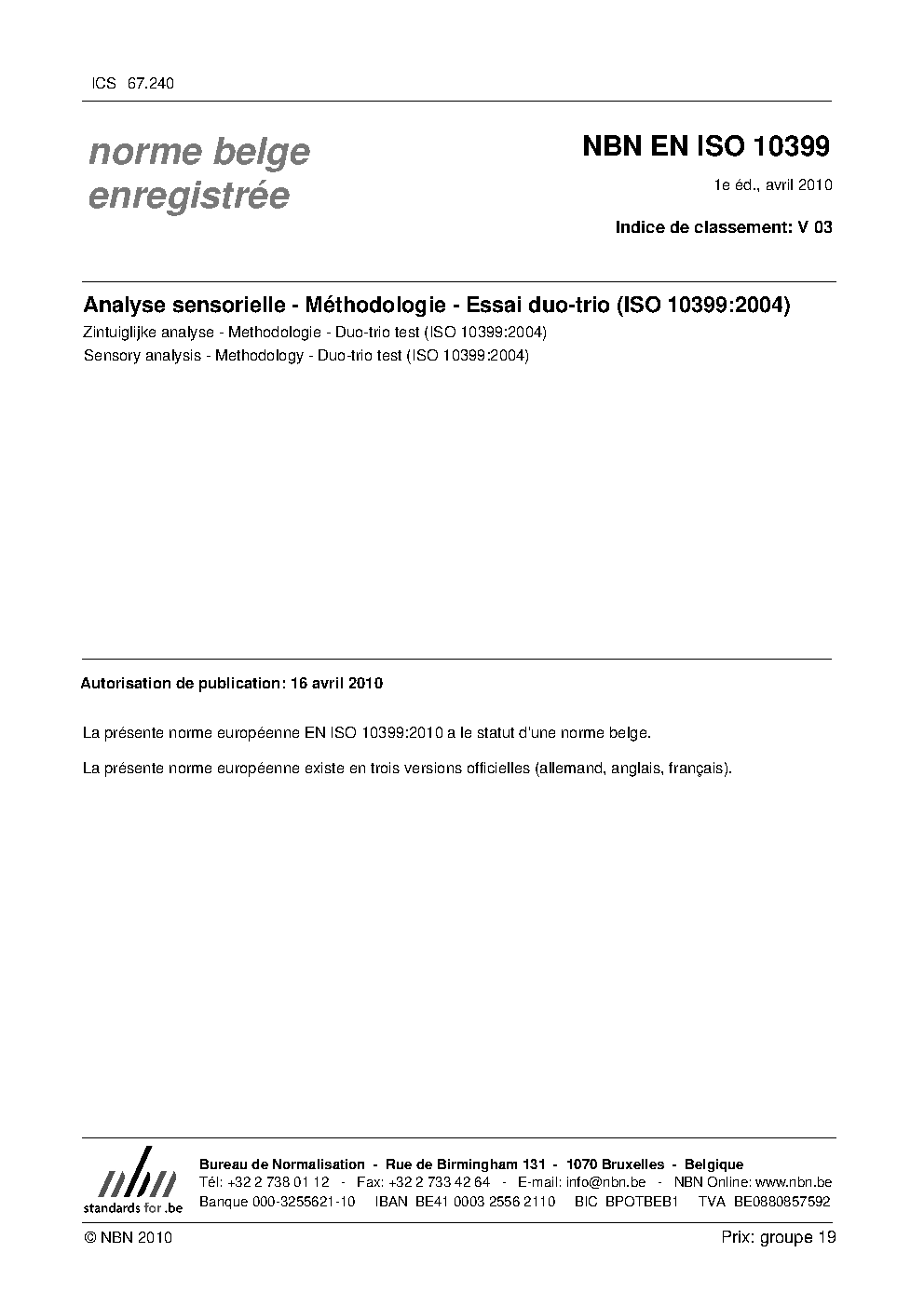 Sensory analysis - Methodology - Duo-trio test (ISO 10399:2004)