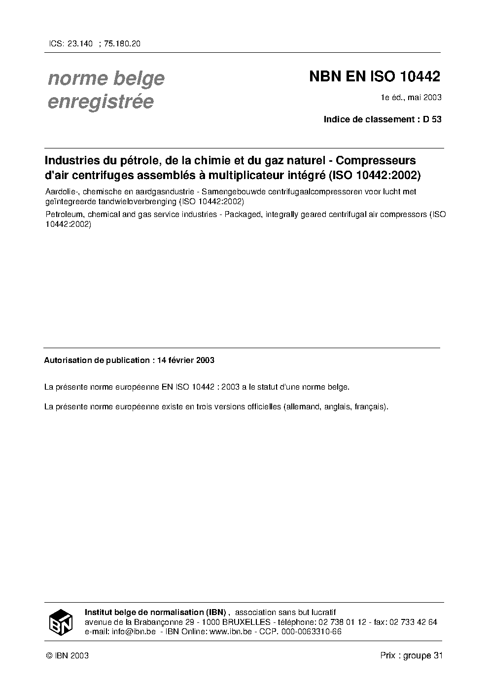 ISO 10442:2002 specifies requirements and gives recommendations for the design, materials, fabrication, inspection, testing and preparation for shipment of constant-speed, packaged, integrally geared centrifugal air compressors, including their accessories, for use in the petroleum, chemical and gas service industries. It is also applicable to gas services other than air that are non-hazardous and non-toxic. It is not applicable to machines that develop a pressure rise of less than 35 kPa above atmospheric pressure, which are classed as fans or blowers.