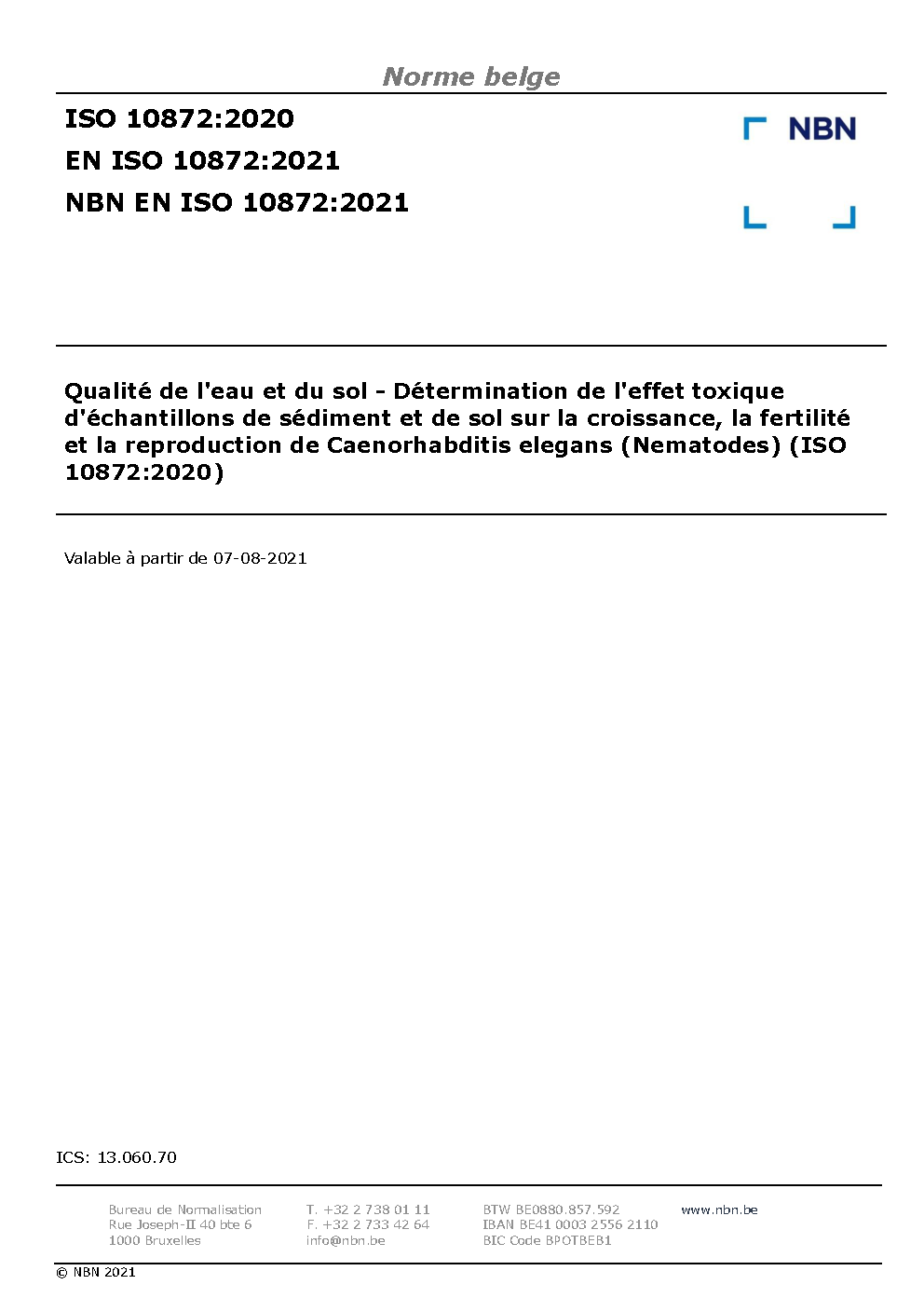 Water and soil quality - Determination of the toxic effect of sediment and soil samples on growth, fertility and reproduction of Caenorhabditis elegans (Nematoda) (ISO 10872:2020)