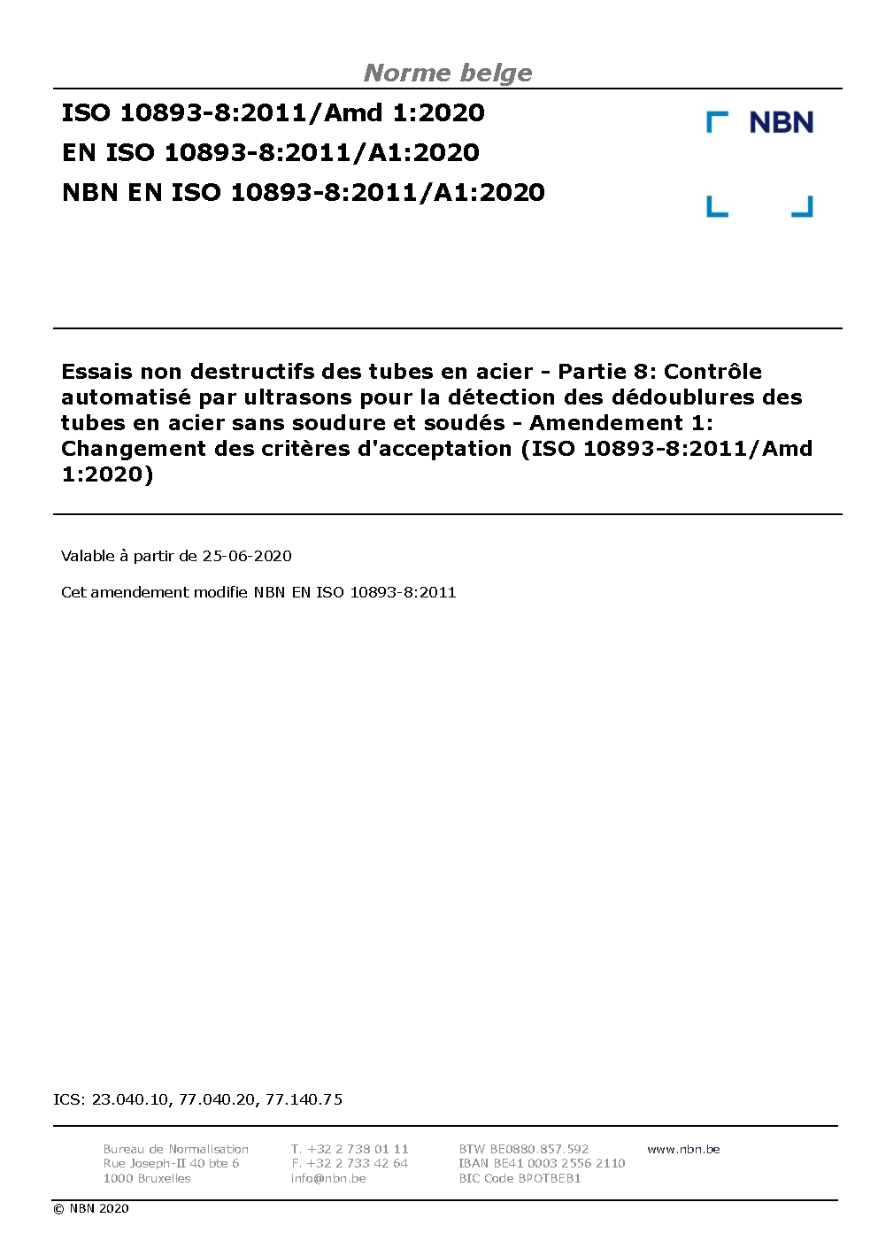 Non-destructive testing of steel tubes - Part 8: Automated ultrasonic testing of seamless and welded steel tubes for the detection of laminar imperfections - Amendment 1: Change acceptance criteria (ISO 10893-8:2011/Amd 1:2020)