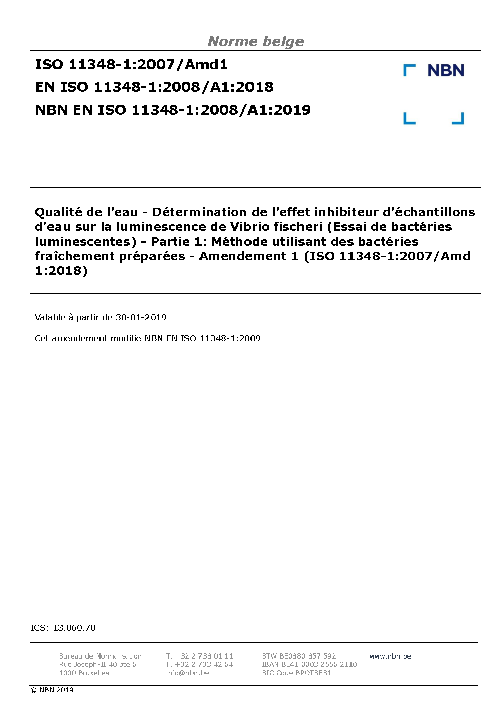Water quality - Determination of the inhibitory effect of water samples on the light emission of Vibrio fischeri (Luminescent bacteria test) - Part 1: Method using freshly prepared bacteria - Amendment 1 (ISO 11348-1:2007/Amd 1:2018)