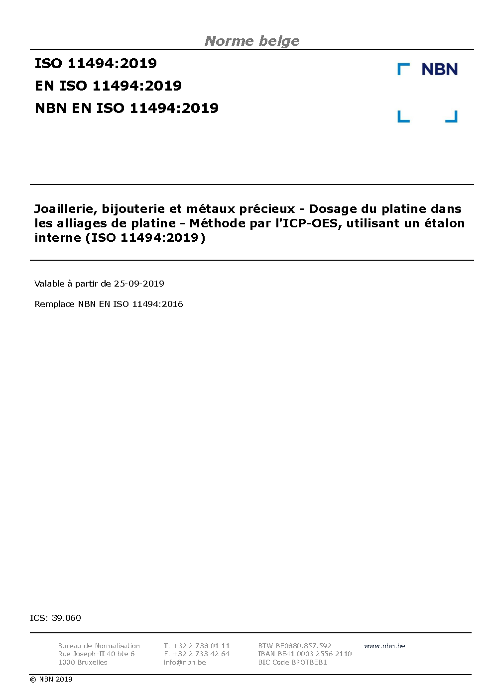 Jewellery and precious metals - Determination of platinum in platinum alloys - ICP-OES method using an internal standard element (ISO 11494:2019)