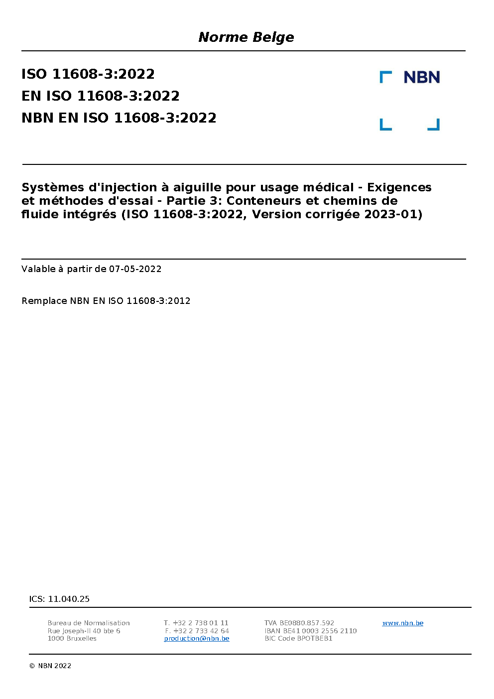 This document specifies requirements and test methods for design verification of containers and integrated fluid paths used with Needle-Based Injection Systems (NISs) according to ISO 11608-1.