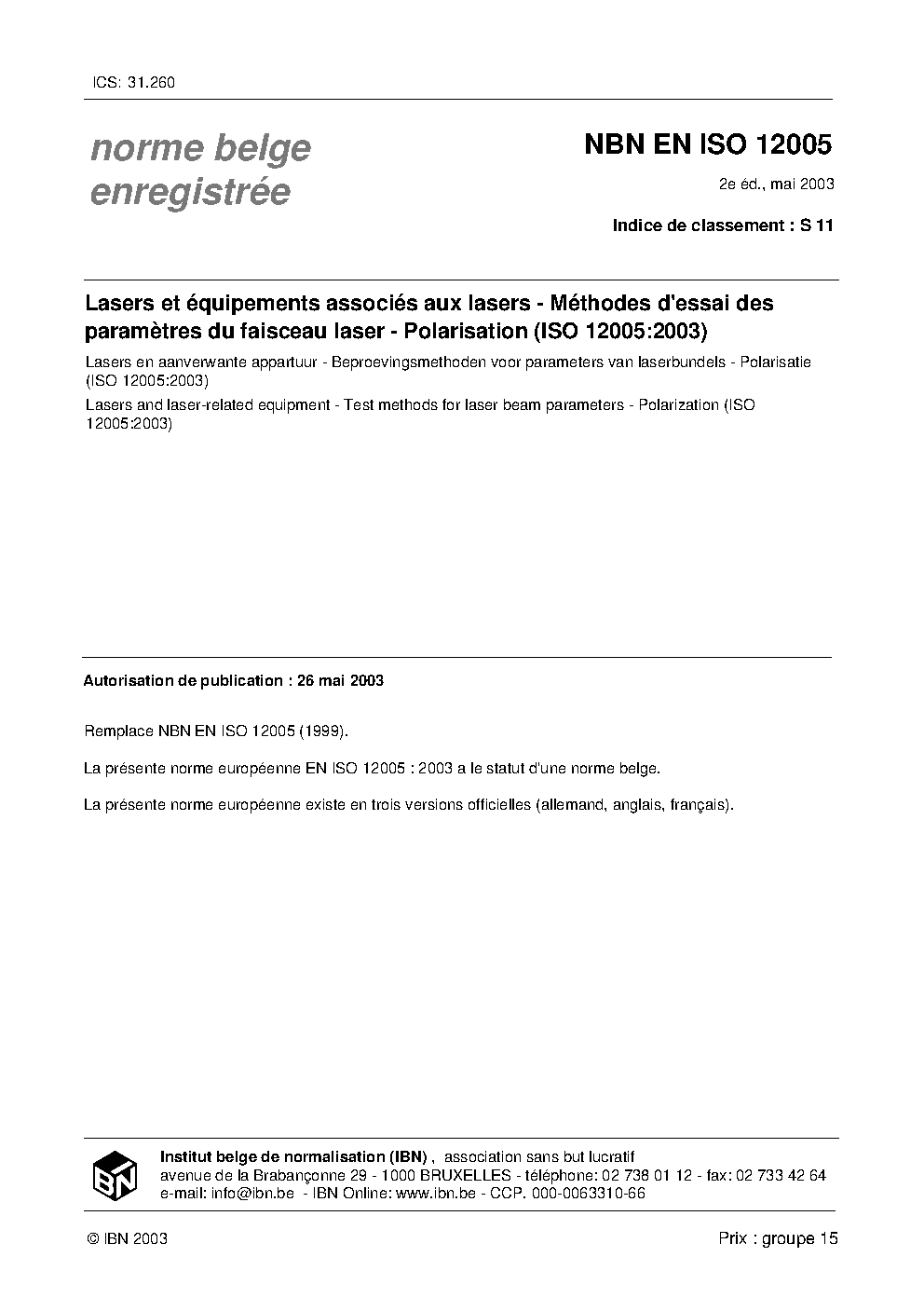 ISO 12005:2003 specifies a method for determining the polarization status and, whenever possible, the degree of polarization of the beam from a continuous wave (cw) laser. It can also be applied to repetitively pulsed lasers, if their electric field vector orientation does not change from pulse to pulse.