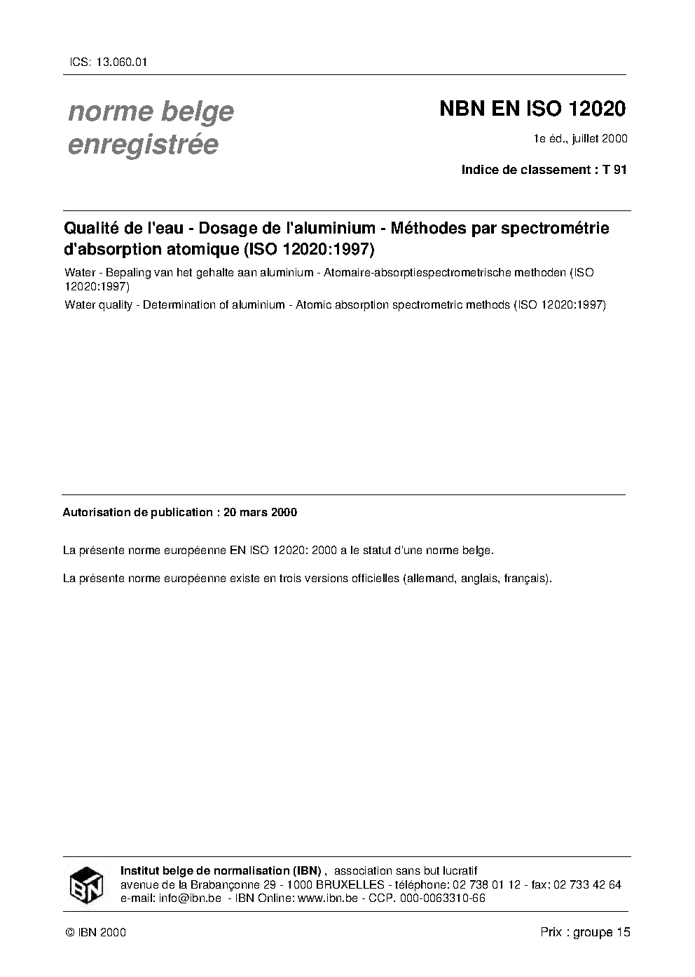 | Publisher | Bureau de Normalisation Belge (NBN) |