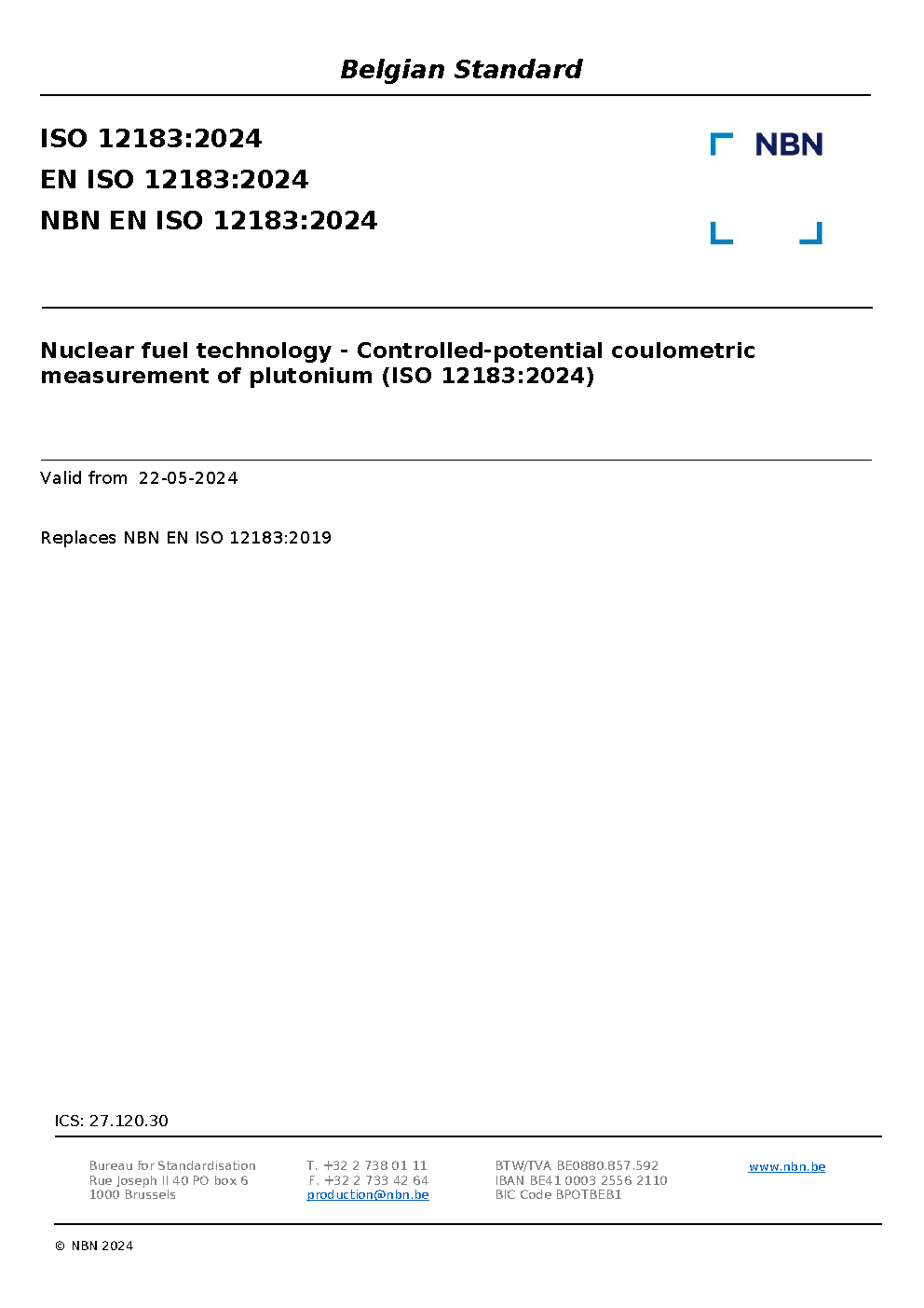 Nuclear fuel technology - Controlled-potential coulometric measurement of plutonium (ISO 12183:2024)