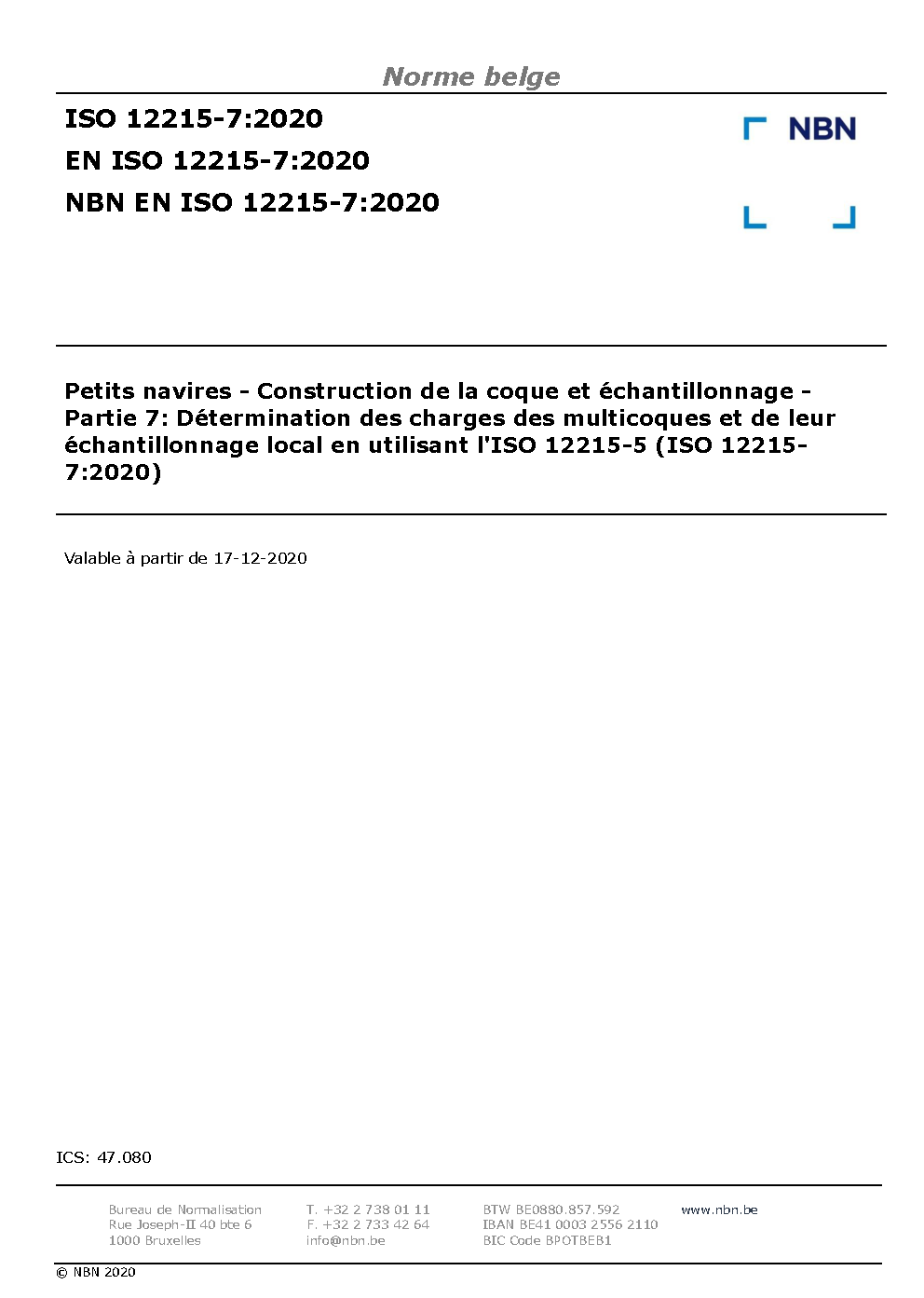 Small craft - Hull construction and scantlings - Part 7: Determination of loads for multihulls and of their local scantlings using ISO 12215-5 (ISO 12215-7:2020)