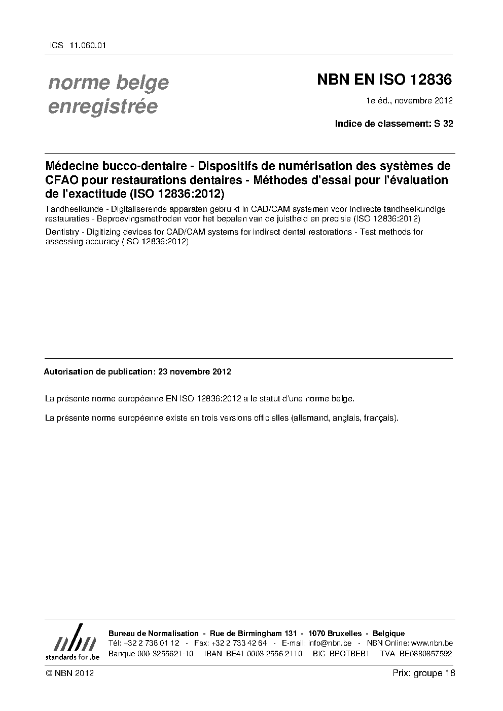 ISO 12836:2012 specifies test methods for the assessment of the accuracy of digitizing devices for computer-aided design/computer-aided manufacturing (CAD/CAM) systems for indirect dental restorations.