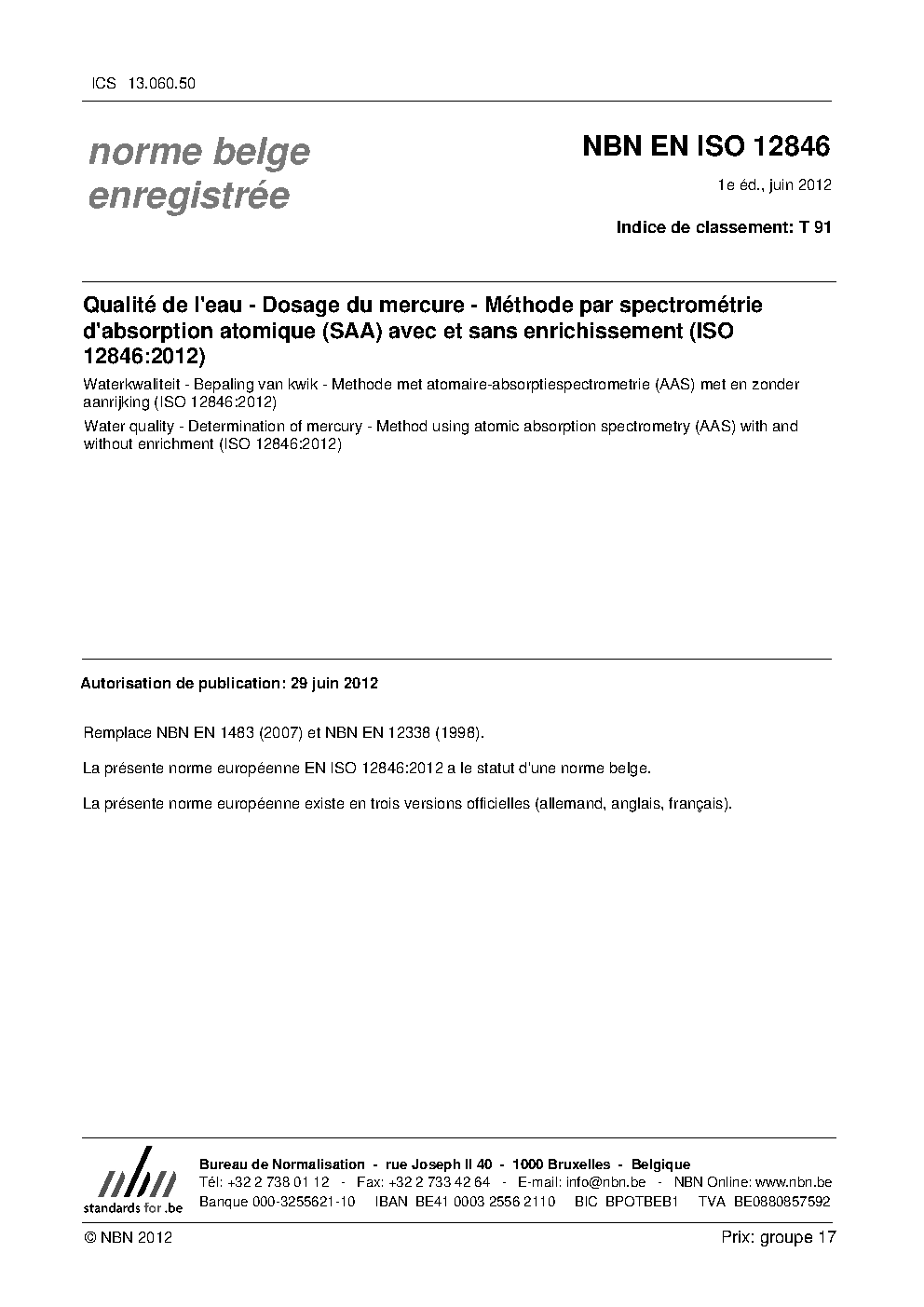 Water quality - Determination of mercury - Method using atomic absorption spectrometry (AAS) with and without enrichment (ISO 12846:2012)