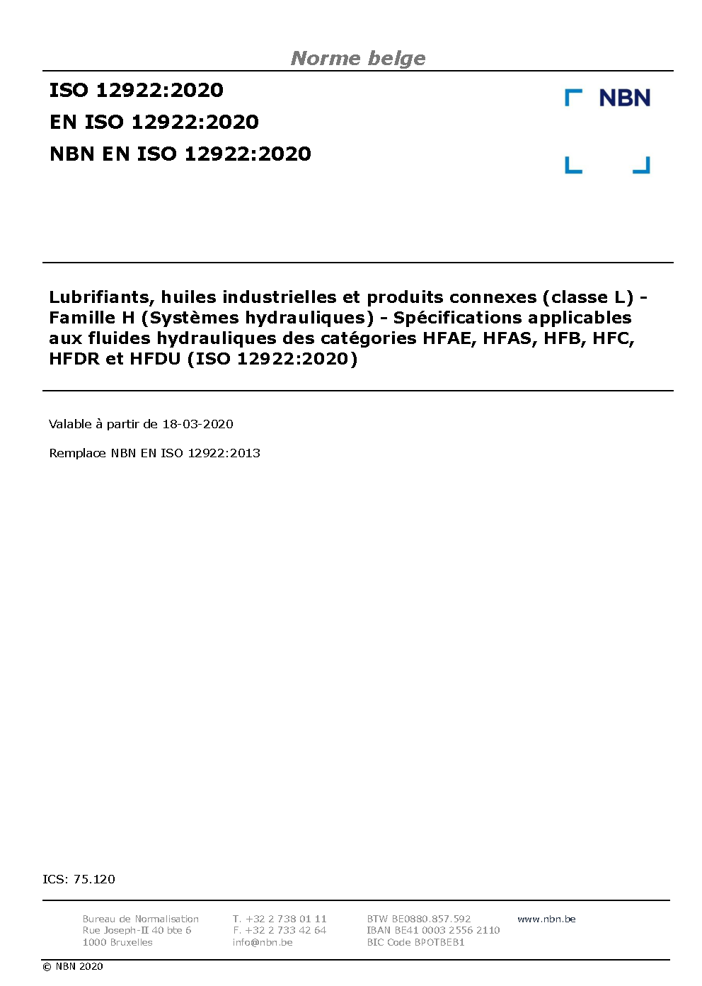 Lubricants, industrial oils and related products (class L) - Family H (Hydraulic systems) - Specifications for hydraulic fluids in categories HFAE, HFAS, HFB, HFC, HFDR and HFDU (ISO 12922:2020)