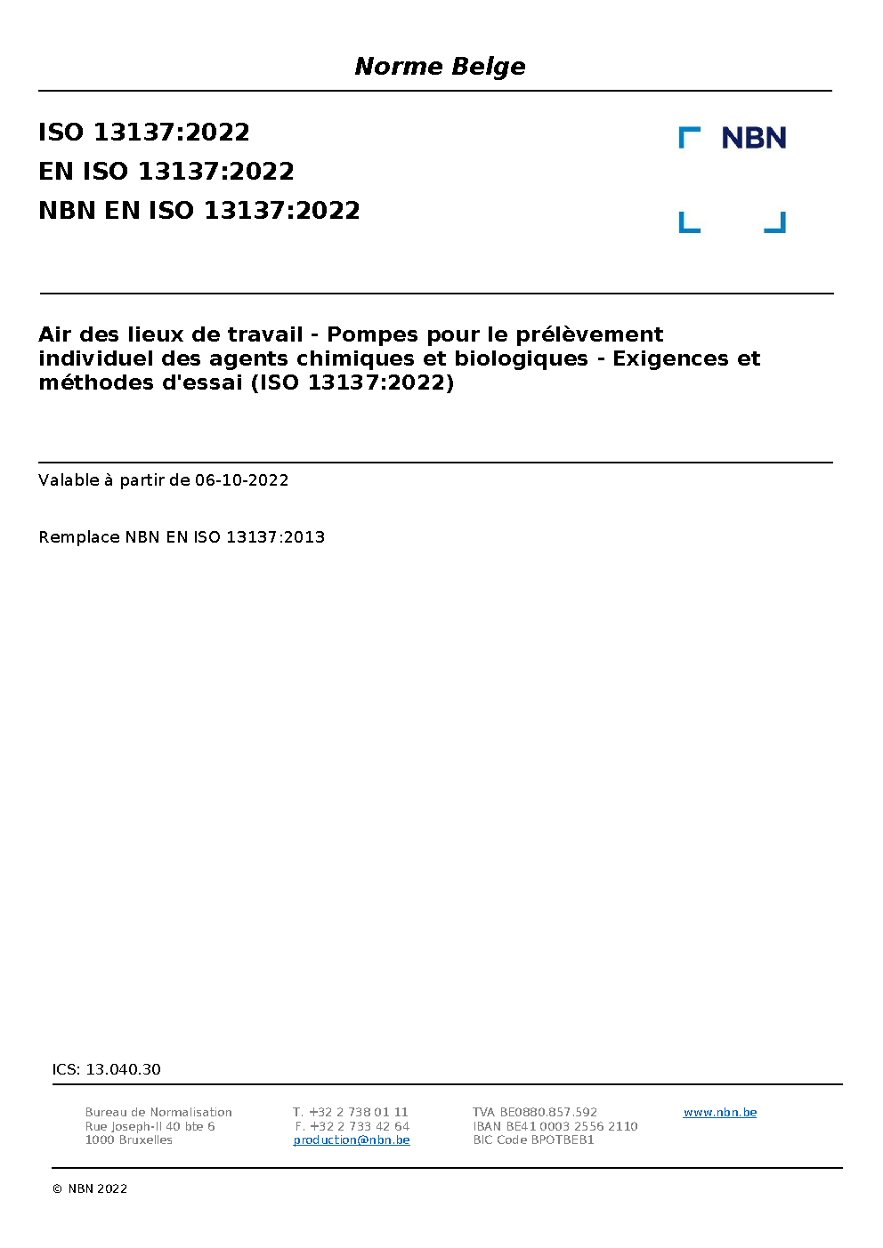 Workplace atmospheres - Pumps for personal sampling of chemical and biological agents - Requirements and test methods (ISO 13137:2022)