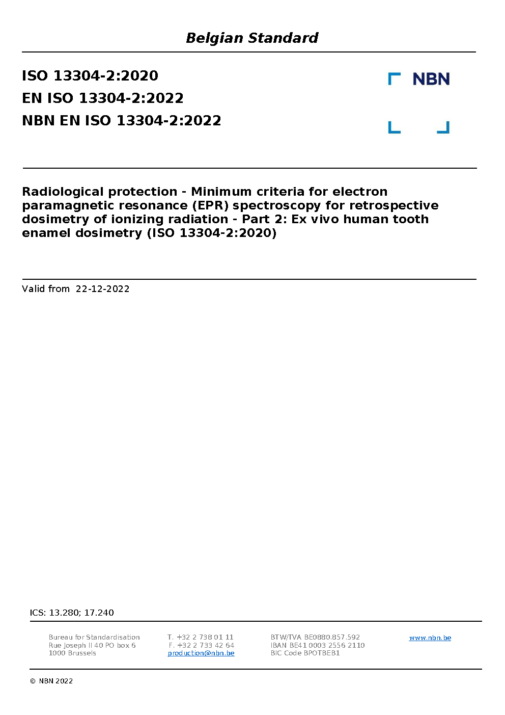 Radiological protection - Minimum criteria for electron paramagnetic resonance (EPR) spectroscopy for retrospective dosimetry of ionizing radiation - Part 2: Ex vivo human tooth enamel dosimetry (ISO 13304-2:2020)