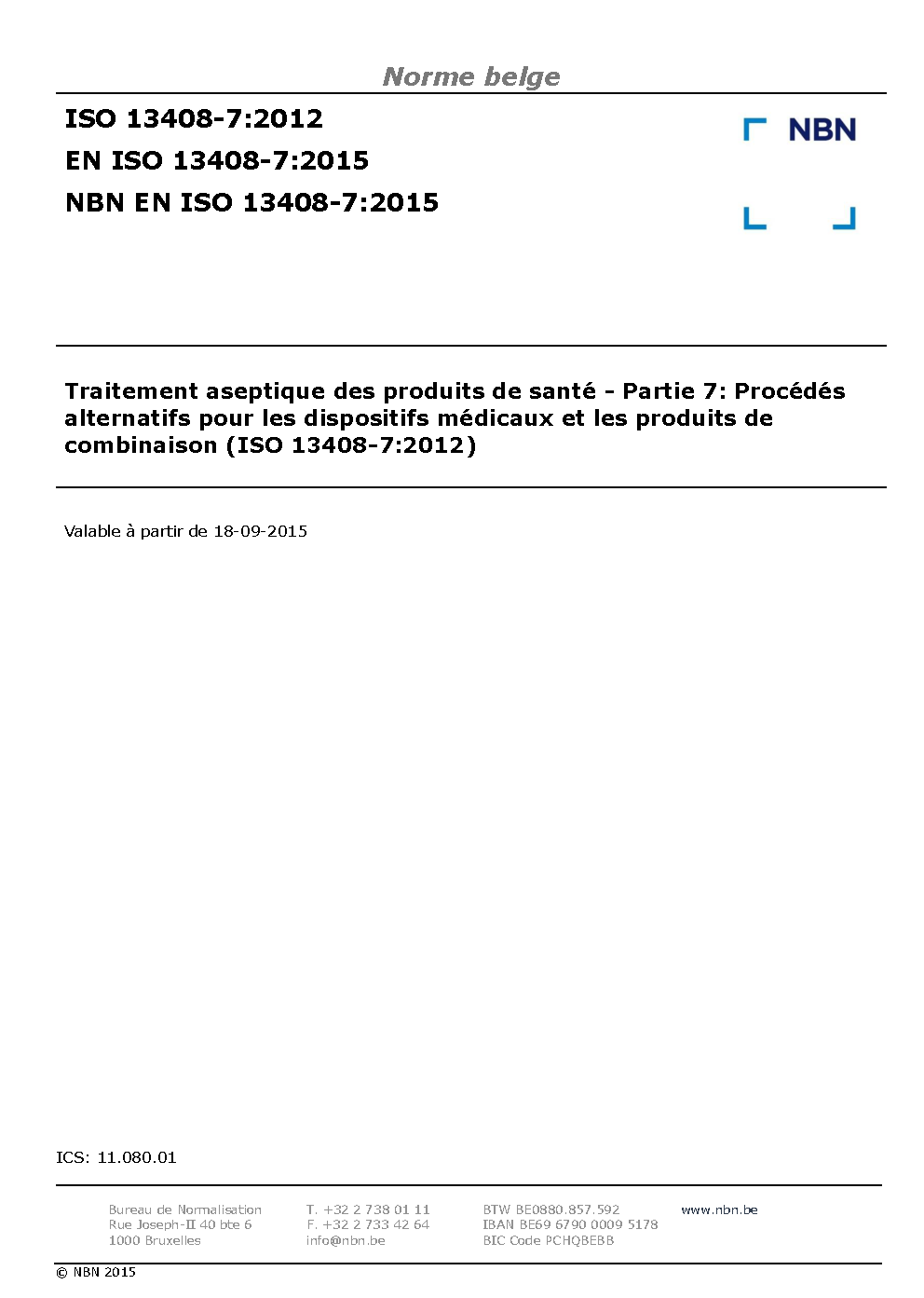 Aseptic processing of health care products - Part 7: Alternative processes for medical devices and combination products (ISO 13408-7:2012)
