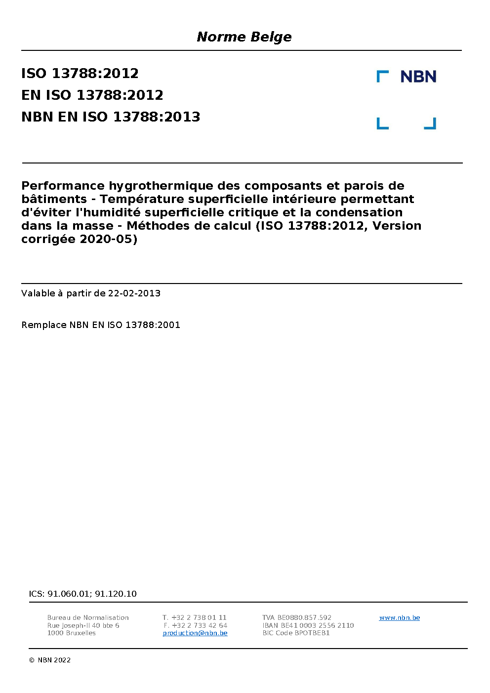 Hygrothermal performance of building components and building elements - Internal surface temperature to avoid critical surface humidity and interstitial condensation - Calculation methods (ISO 13788:2012, Corrected version 2020-05)
