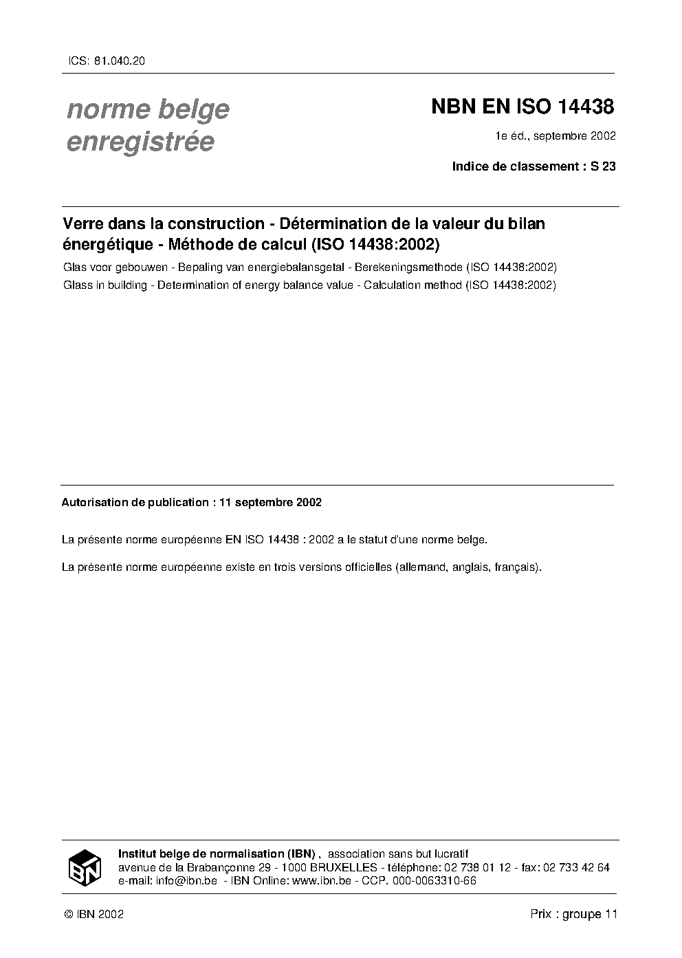 Glass in building - Determination of energy balance value - Calculation method (ISO 14438:2002)