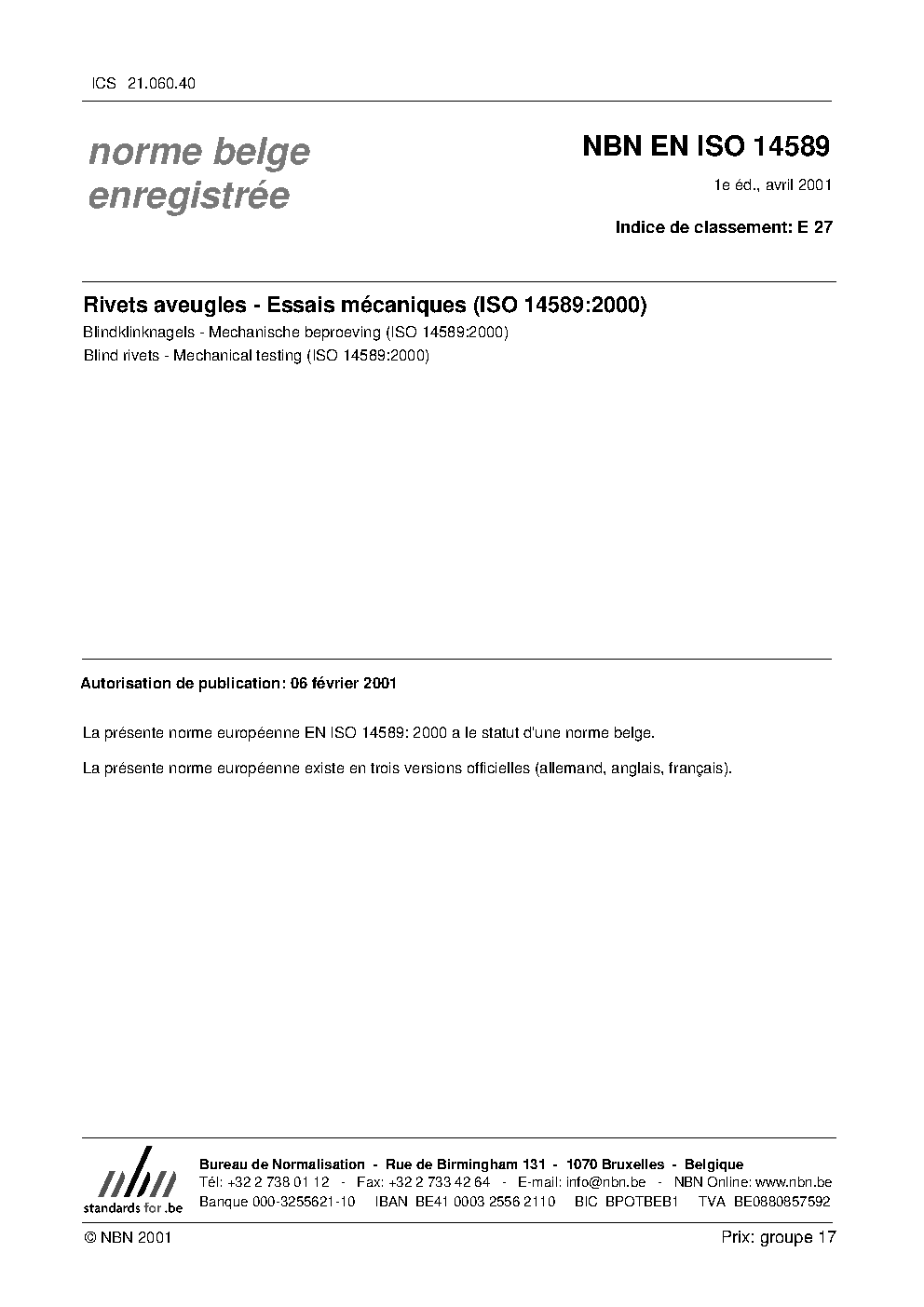 | Publisher | Bureau de Normalisation Belge (NBN) |