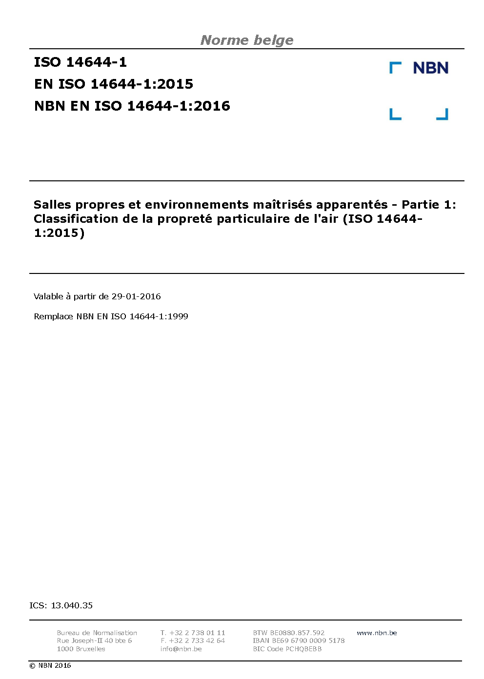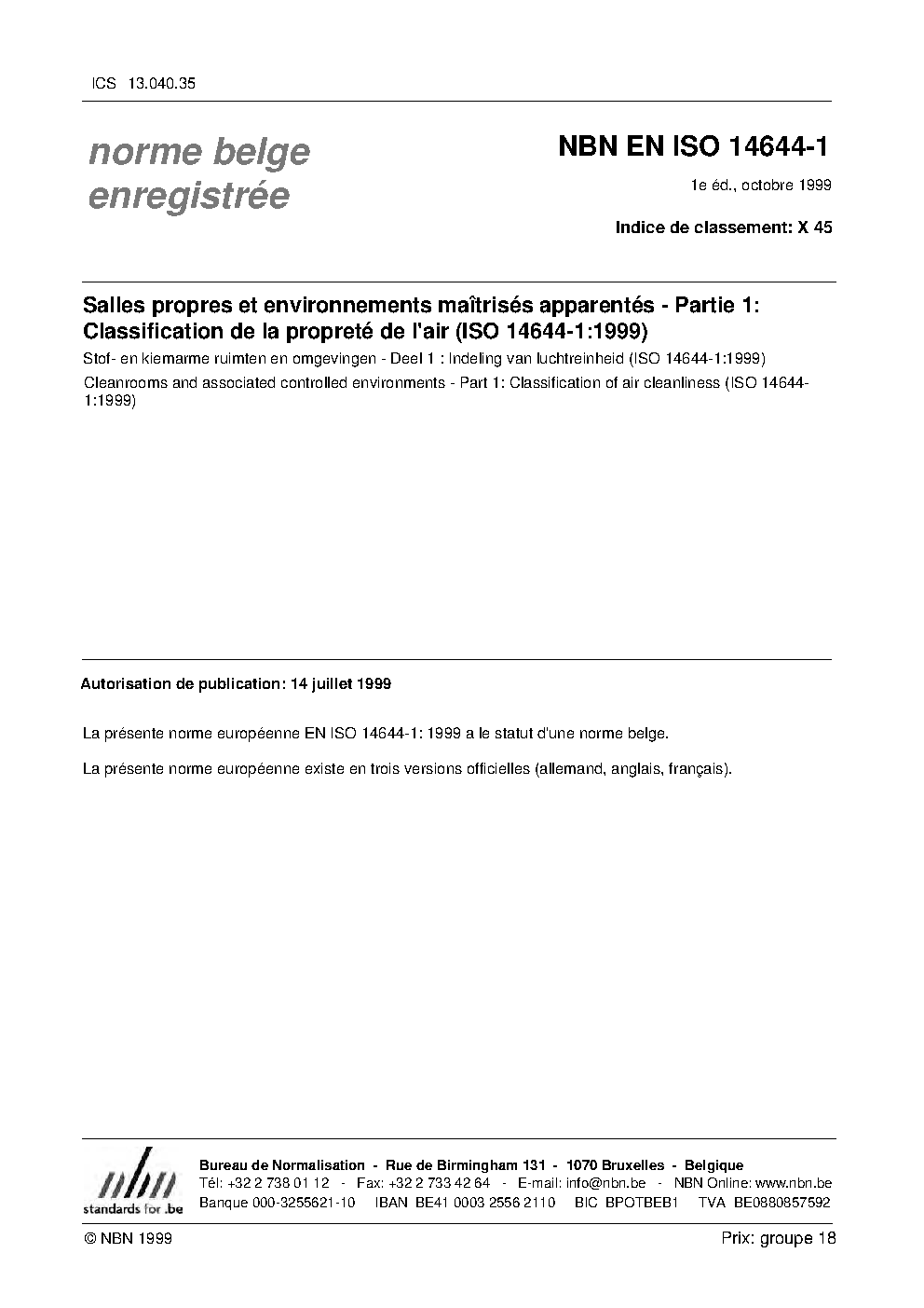 NBN EN ISO 14644-1:1999