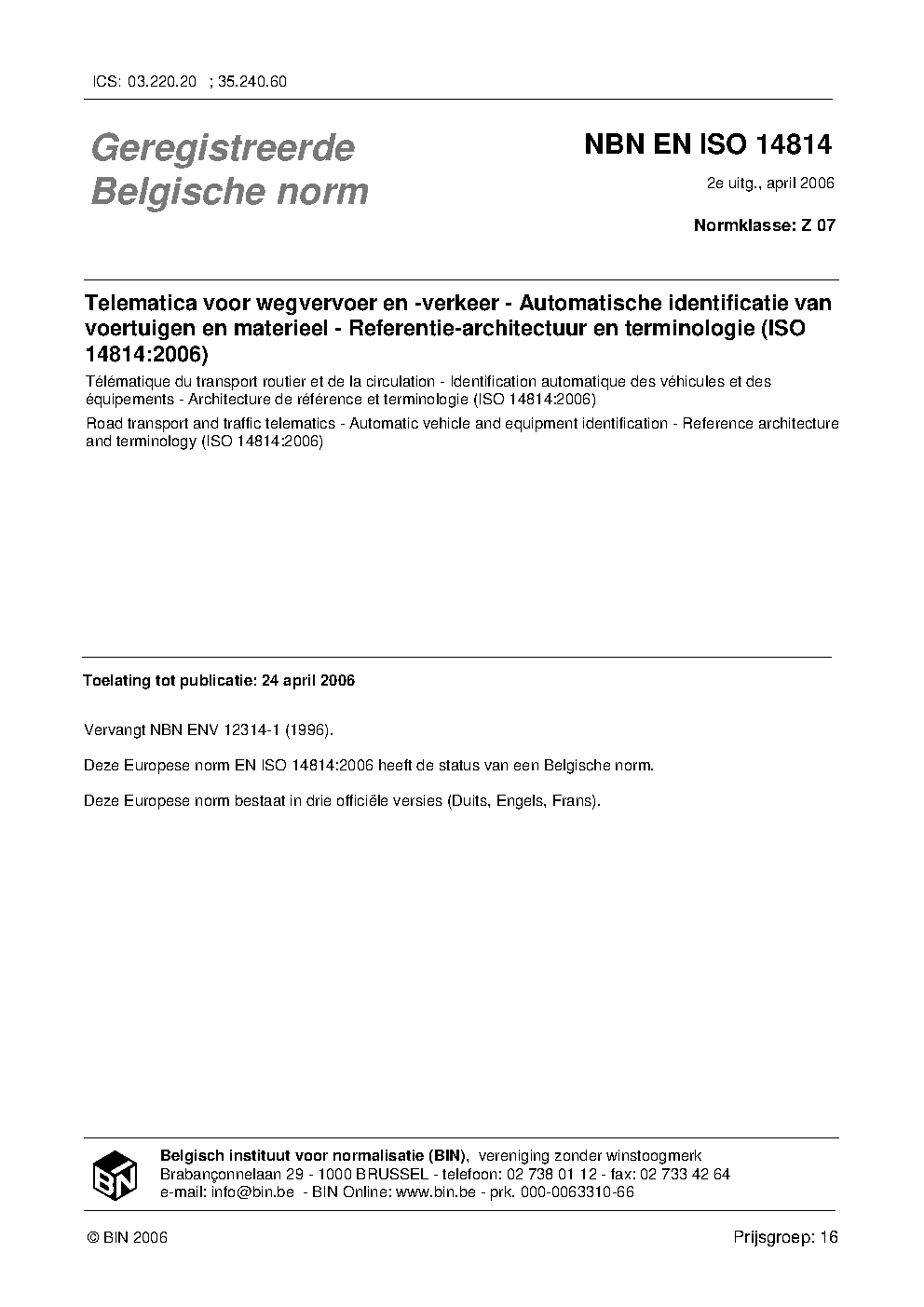 | Publisher | Bureau de Normalisation Belge (NBN) |