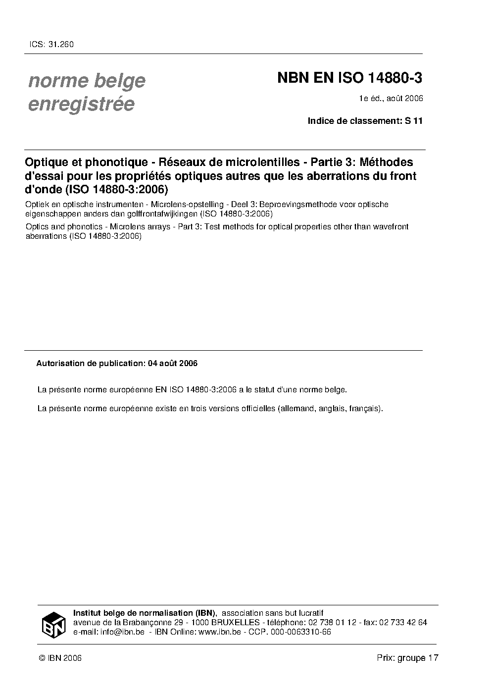 ISO 14880-3:2006 specifies methods for testing optical properties, other than wavefront aberrations, of microlenses in microlens arrays. It is applicable to microlens arrays with very small lenses formed on one or more surfaces of a common substrate and to graded index microlenses.