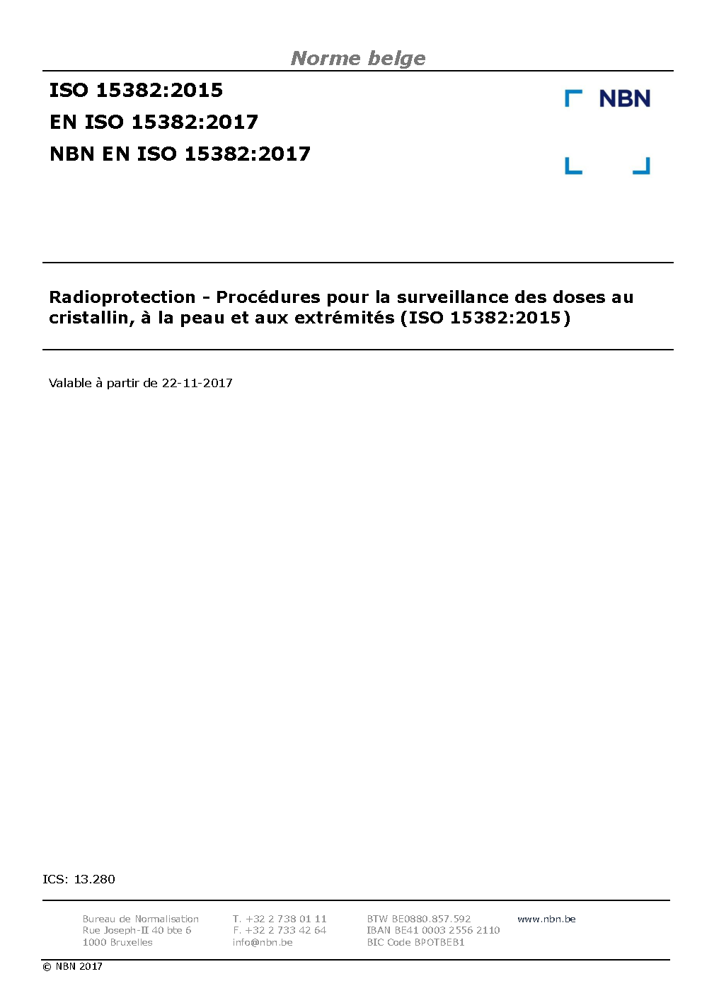 ISO 15382:2015 specifies procedures for individual monitoring of radiation exposure of the skin, extremities (hands, fingers, wrists, forearms, feet and ankles), and lens of the eye in planned exposure situations. It covers practices which involve a risk of exposure to photons in the range of 8 keV to 10 MeV and electrons and positrons in the range of 60 keV to 10 MeV.
