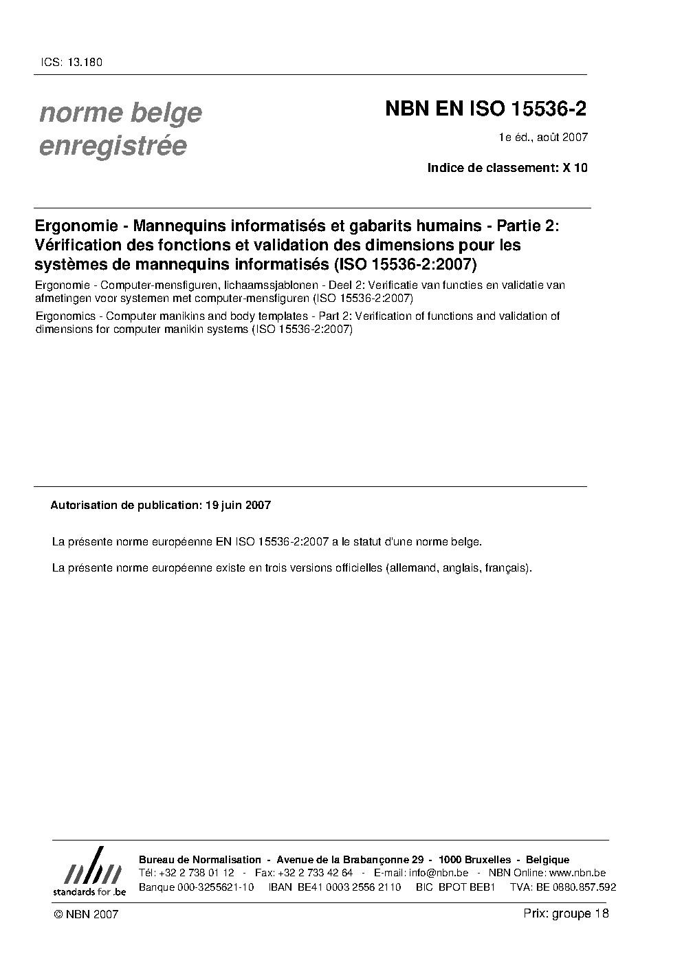 Ergonomics - Computer manikins and body templates - Part 2: Verification of functions and validation of dimensions for computer manikin systems (ISO 15536-2:2007)