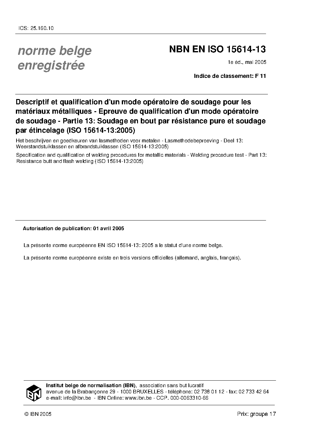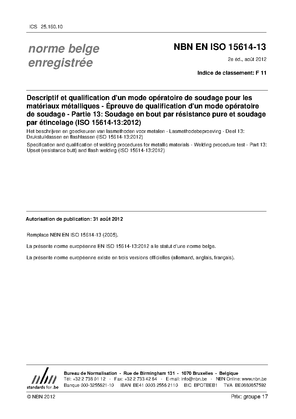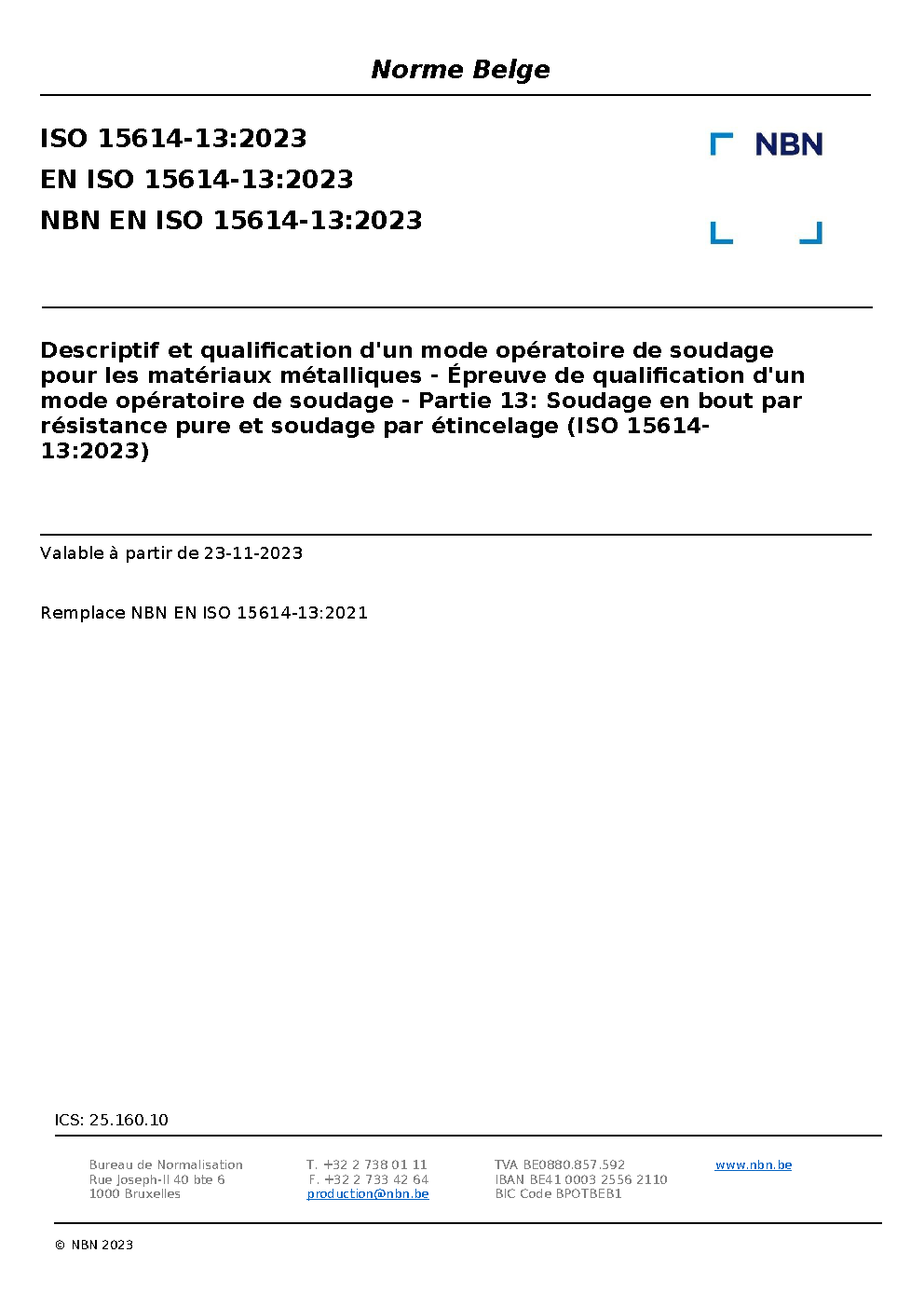 Specification and qualification of welding procedures for metallic materials - Welding procedure test - Part 13: Upset (resistance butt) and flash welding (ISO 15614-13:2023)