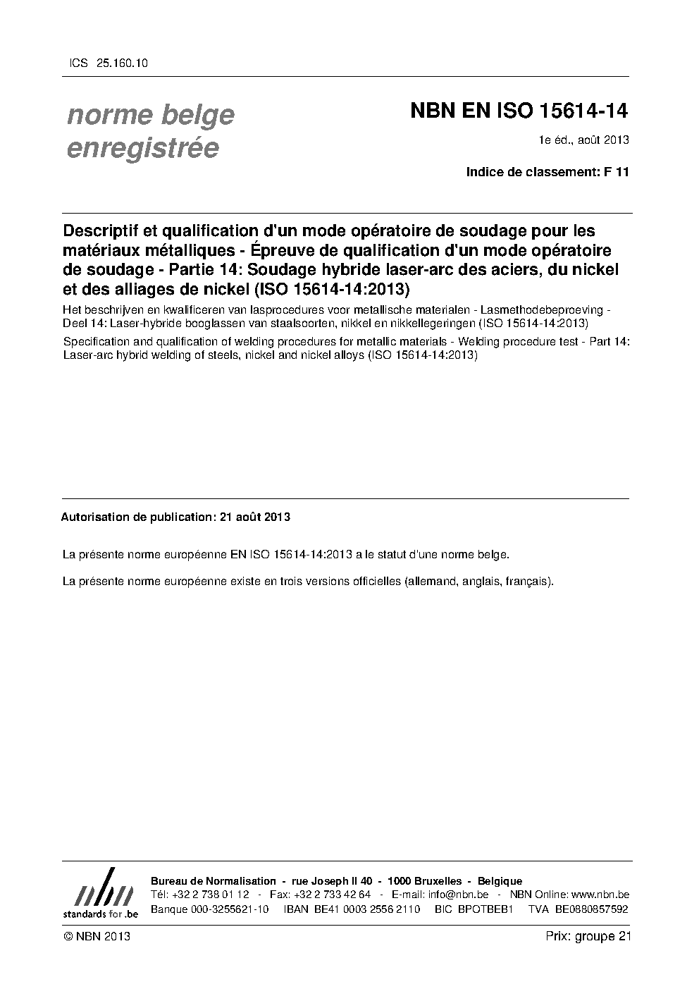 NBN EN ISO 15614-14:2013