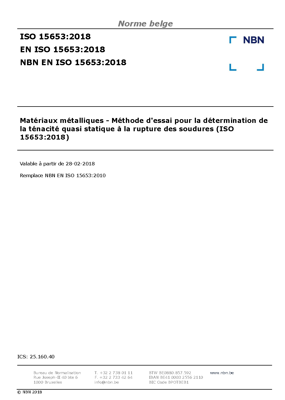 Metallic materials - Method of test for the determination of quasistatic fracture toughness of welds (ISO 15653:2018)
