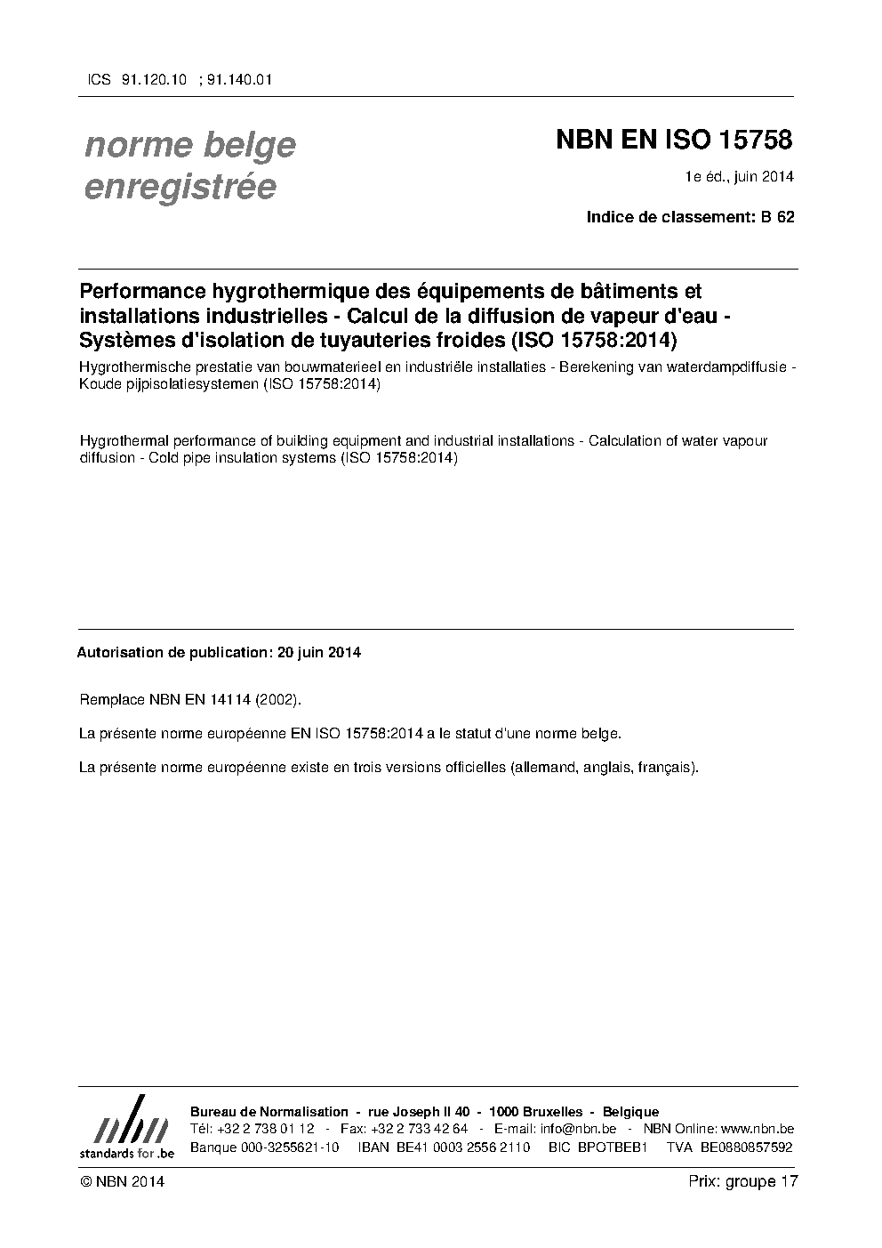 Hygrothermal performance of building equipment and industrial installations - Calculation of water vapour diffusion - Cold pipe insulation systems (ISO 15758:2014)
