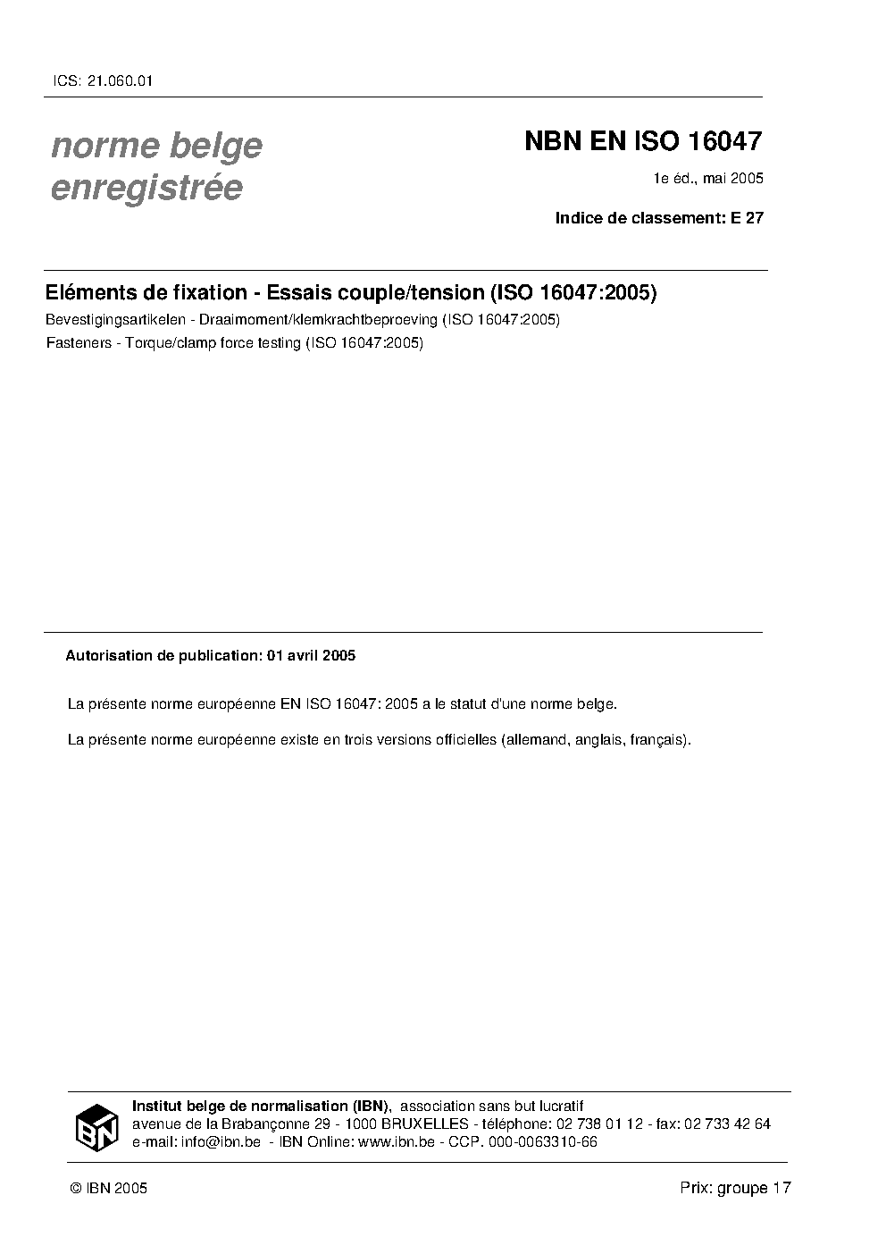 ISO 16047:2005 specifies the conditions for carrying out torque/clamp force tests on threaded fasteners and related parts. It is applicable, basically, to bolts, screws, studs and nuts made of carbon steel and alloy steel, whose mechanical properties are specified in ISO 898-1, ISO 898-2 or ISO 898-6, having ISO metric threads with thread sizes M3 to M39. It is also applicable to the combination of other externally and internally threaded fasteners with a triangular ISO thread according to ISO 68. It is not applicable to set screws and similar threaded fasteners that are not under tensile stresses, nor to screws which form their own mating thread or threaded fasteners having additional self-locking features.