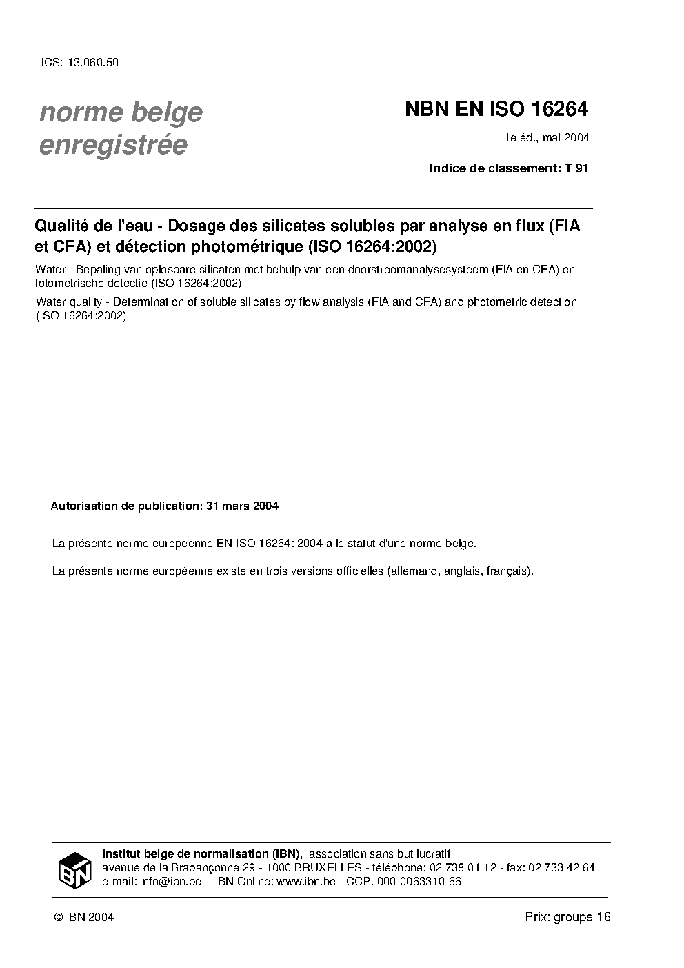 Water quality - Determination of soluble silicates by flow analysis (FIA and CFA) and photometric detection (ISO 16264:2002)