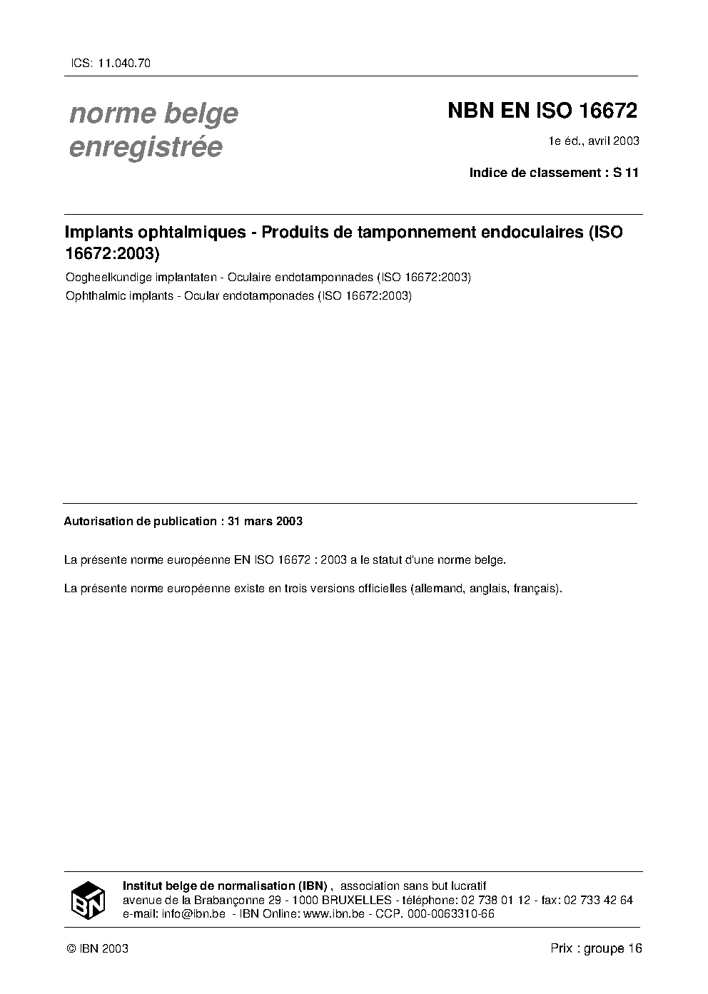 ISO 16672:2003 applies to ocular endotamponades (OEs), a group of non-solid implants used in ophthalmology to flatten and position a detached retina onto the choroid, or to tamponade the retina.