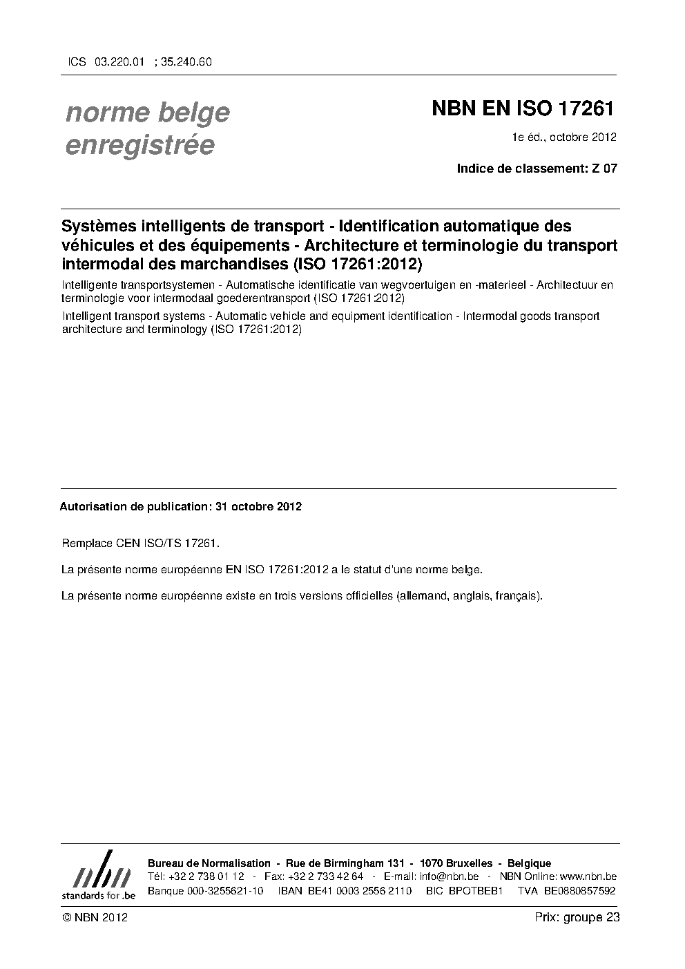 | Publisher | Bureau de Normalisation Belge (NBN) |