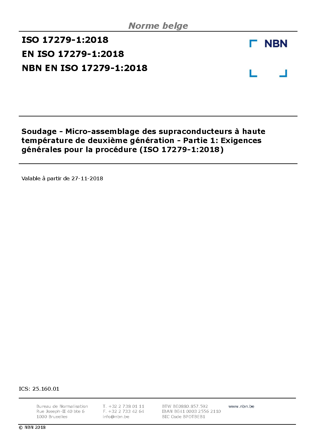Welding - Micro joining of 2nd generation high temperature superconductors - Part 1: General requirements for the procedure (ISO 17279-1:2018)