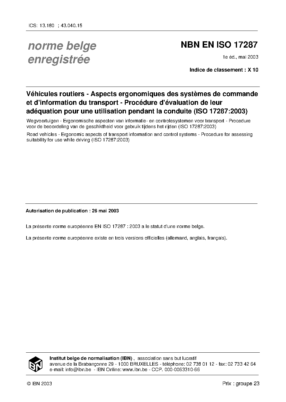 ISO 17287:2003 specifies a procedure for assessing whether specific TICS, or a combination of TICS with other in-vehicle systems, are suitable for use by drivers while driving. It addresses user-oriented TICS description and context of use, TICS task description and analysis, assessment process, and documentation.